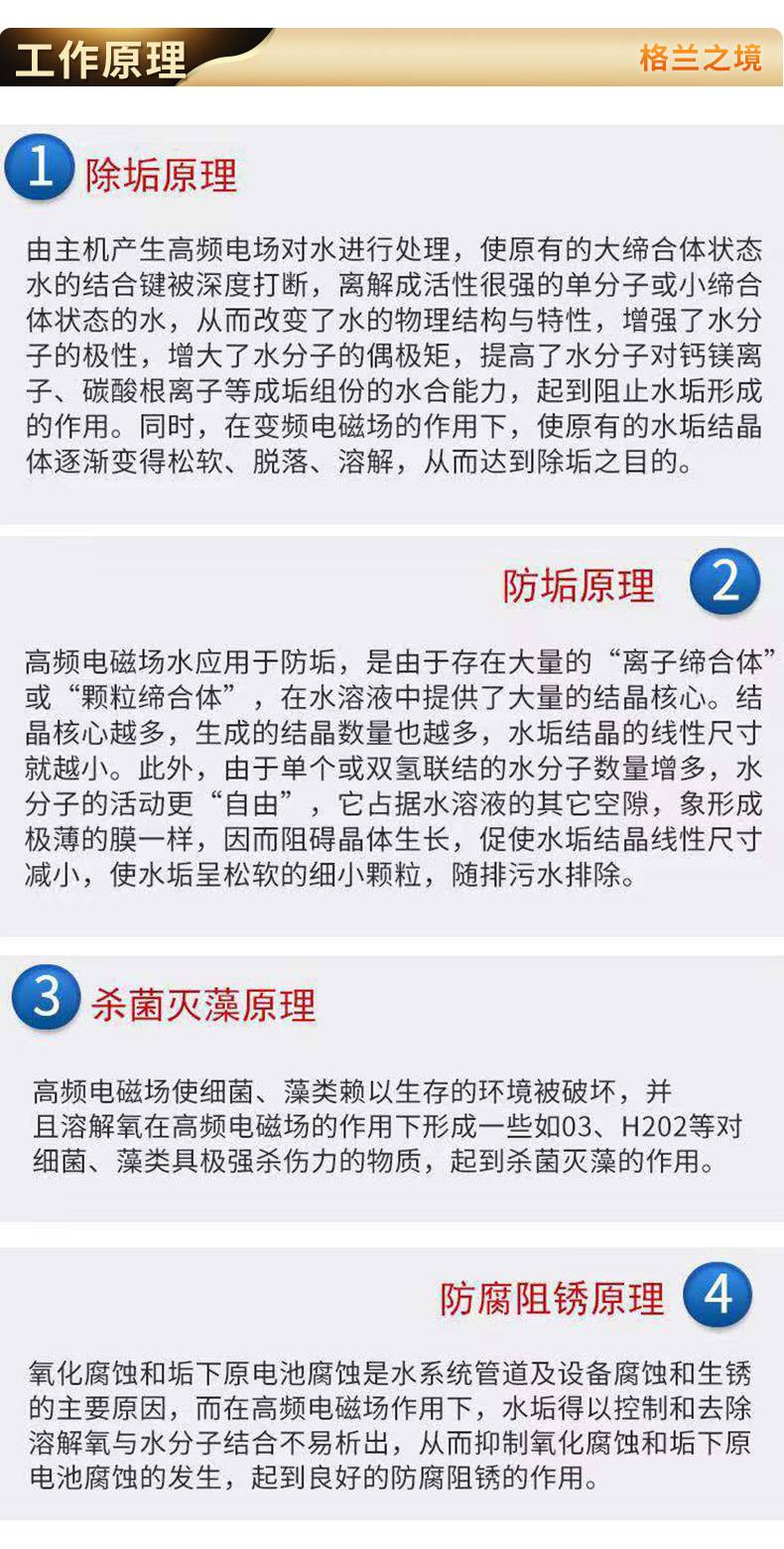 多功能电子水处理仪是利用电子线路产生高频电磁场,使流经除垢仪的水吸收高频电磁能后,将原有的大缔合体的结合键打断,变为活性很高的单分子或小缔合体状态的水,促进了水分子的序排列,增强了水,强了水对成垢离子及其组份的作用,并改变了水中沉积物质的沉积状态,各种离子的物理性能,细和藻类等微生物的生存环境,从而有地起到防垢,除垢,杀,灭藻的作用。sldgle