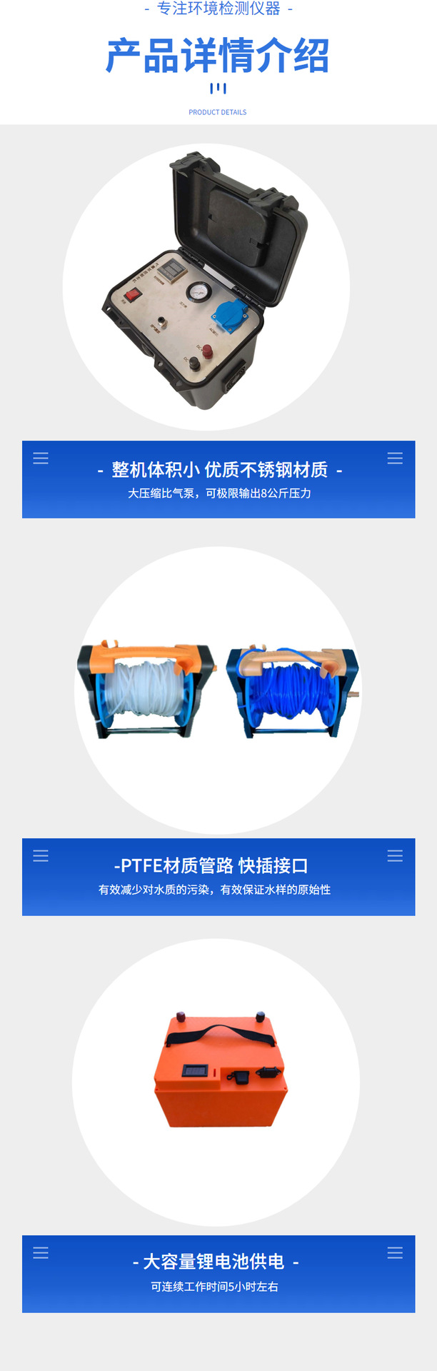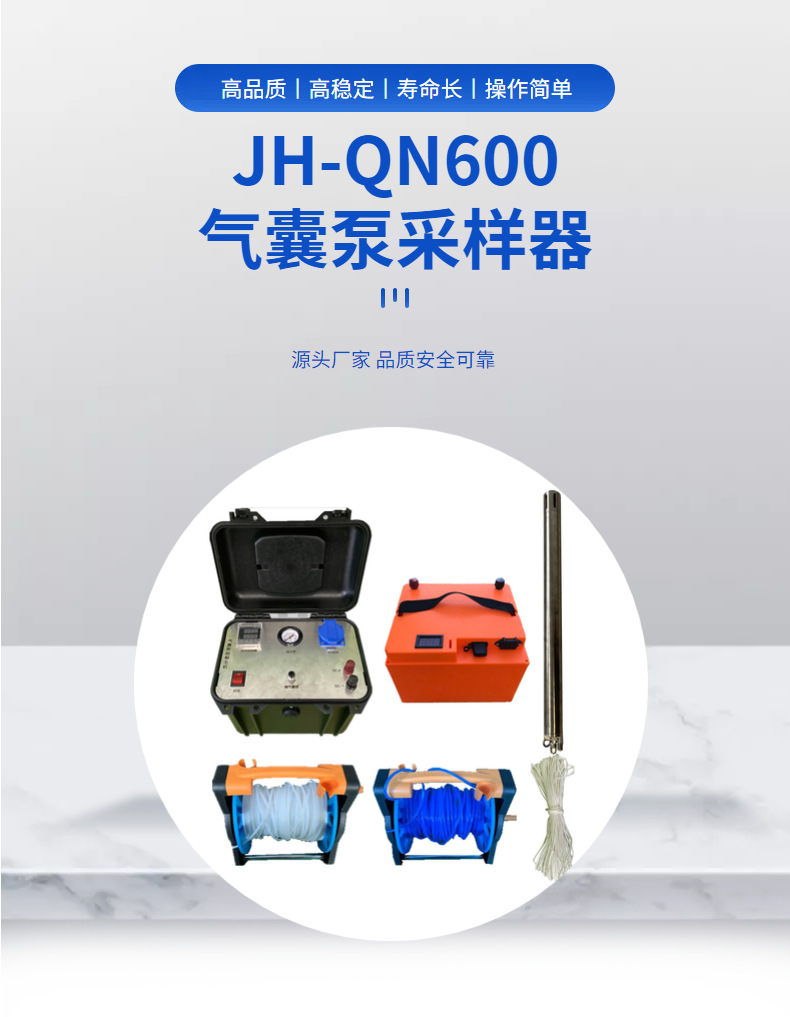JH-QN600型气囊泵采样器,(下称气囊泵)采用通过压缩空气定时开关,对气囊泵腔体进行压缩和释放,从而使腔体内水样从泵体中推到地表,双单向阀设计,当压缩空气关闭时,水又会流入腔体,此过程,水样不与压缩空气进行接触,从而程度保证了水样的原始性。产品广泛适用于环保、安监、卫生、厂企、科研、、教育等部门进行地下水的采样监测。