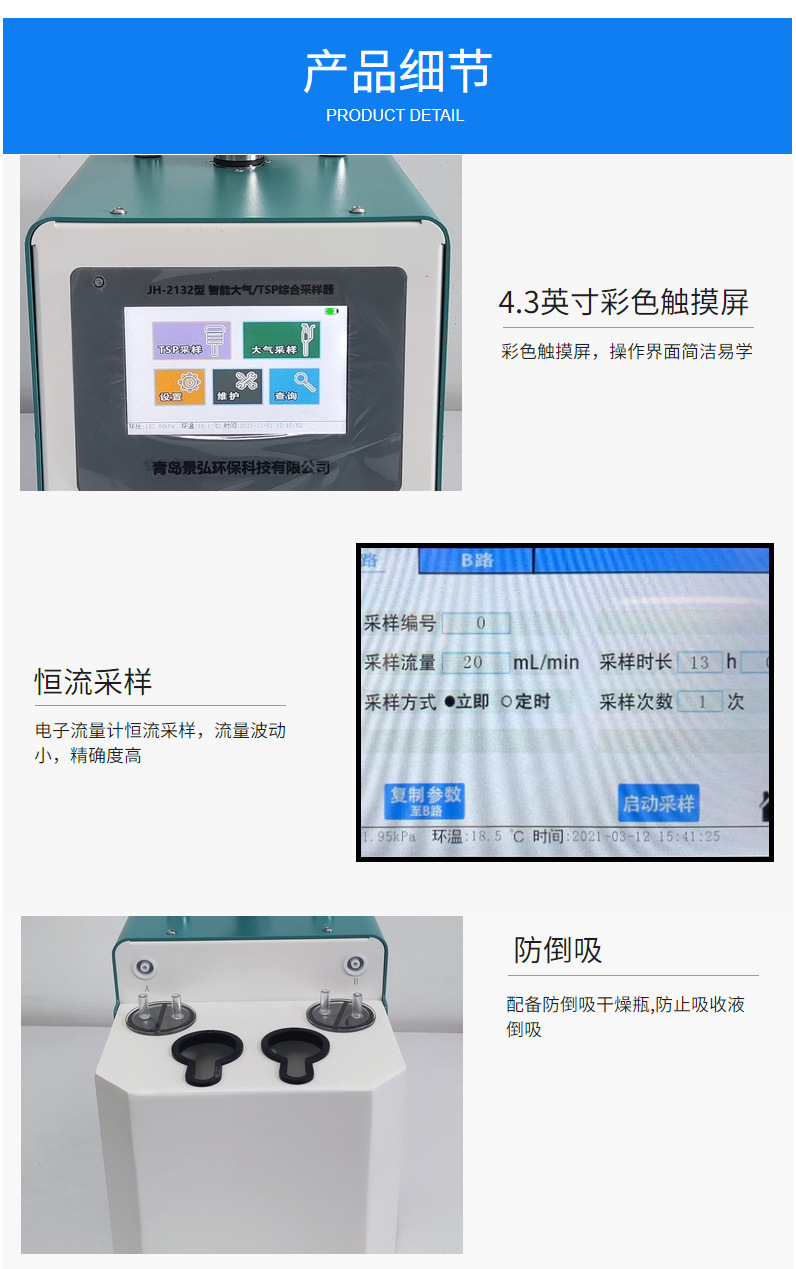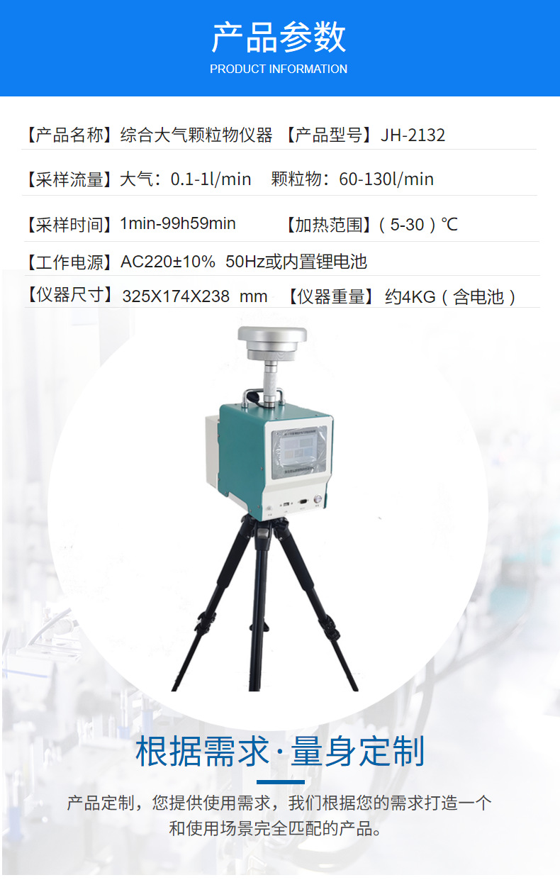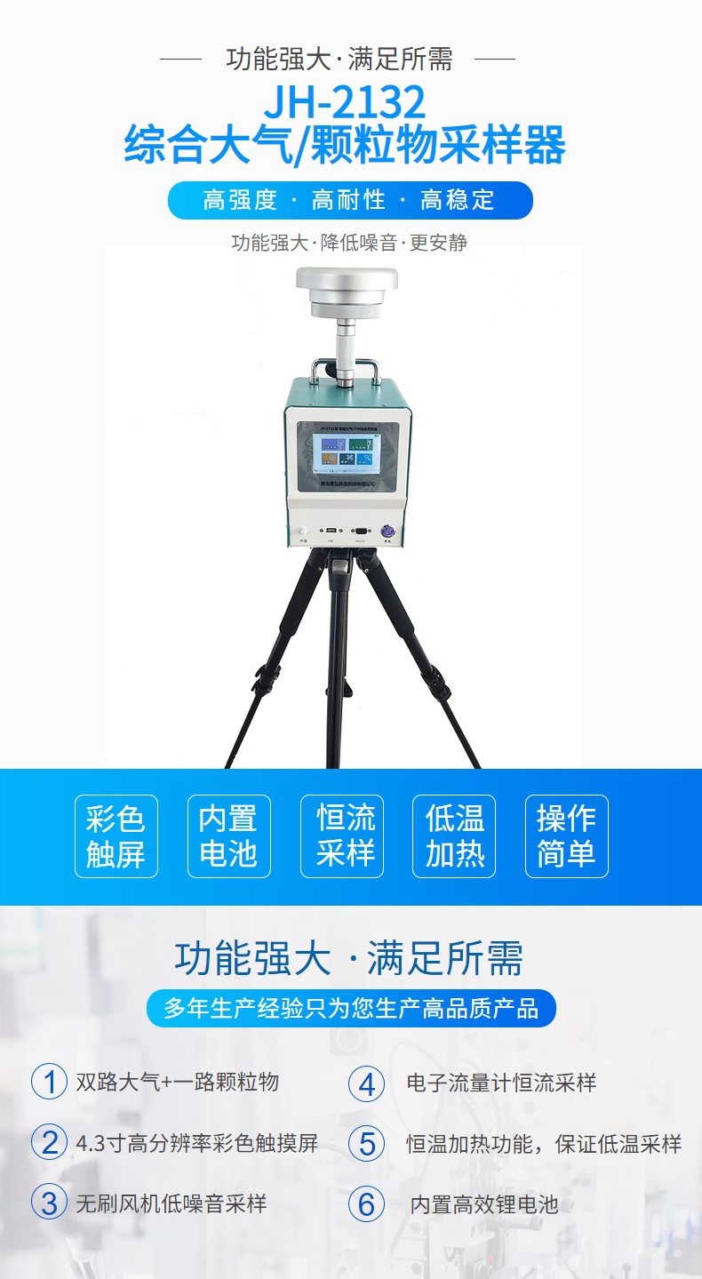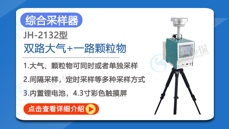 JH-2132型环境空气颗粒物综合采样器,(下称采样器)采用滤膜捕集环境空气中的颗粒物(TSP、PM10、PM2.5),采用溶液吸收采集环境空气中的各类有害气体,产品严格按照国家标准设计研发,适应于环保、安监、卫生、厂企、科研、、教育等部门进行颗粒物、气溶胶、气体的采样监测。