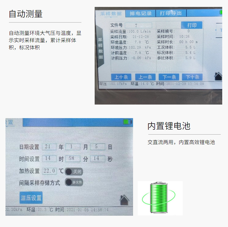 5. 内置高效锂电池,可保证在无外接电源情况下保证采样正常进行,交直流无缝切换。