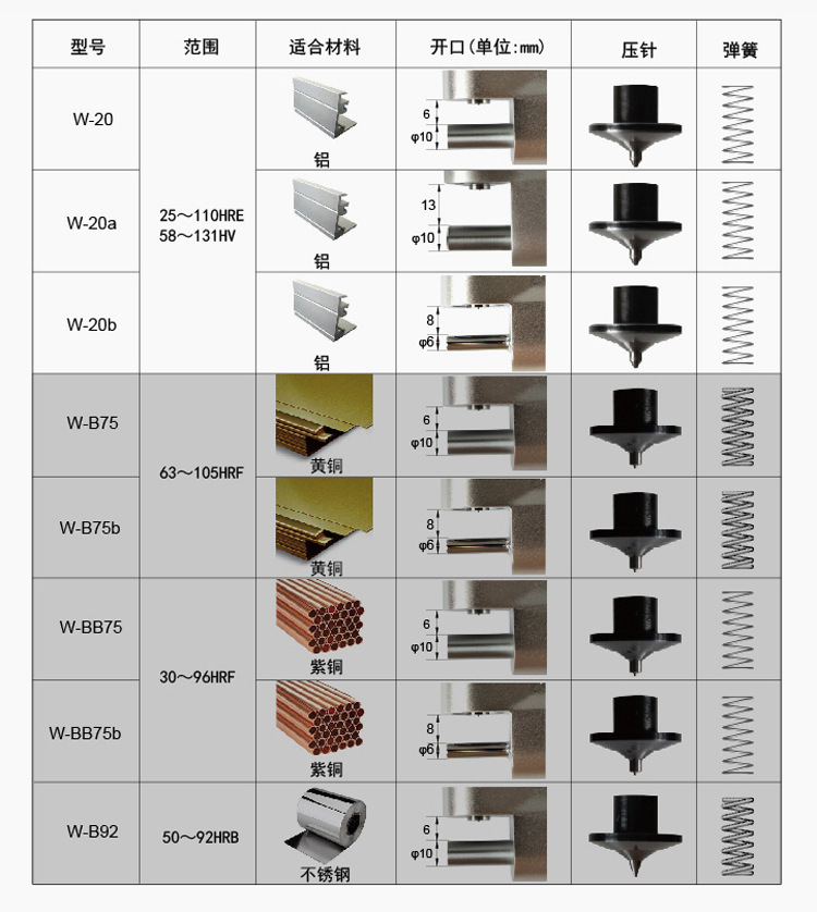 金属韦氏硬度计有W-20、W-20a、W-20b、W-B75、W-B75bb、W-BB75b、W-BB75bb、W-B92八种型号。其适用材料,硬度范围,试样尺寸详见表一。八种型号的仪器都可用于测量管材、板材和型材。对于其他无法用韦氏硬度计测量的材料(如棒材、铸件、锻件及更厚的、弯曲的铝合金材料以及装配件),可选用洛氏硬度计或巴氏硬度计进行快速硬度检测。对于厚度小于0.4mm的材料,使用韦氏硬度计时可能会产生“测砧效应”这时在被测材料的背面会出现一个小的变形痕迹,这种“测砧效应”会引起测量误差,痕迹越大,误差越大;材料越软,厚度越薄,这种误差也会于大。这时应使用表面洛氏硬度计。