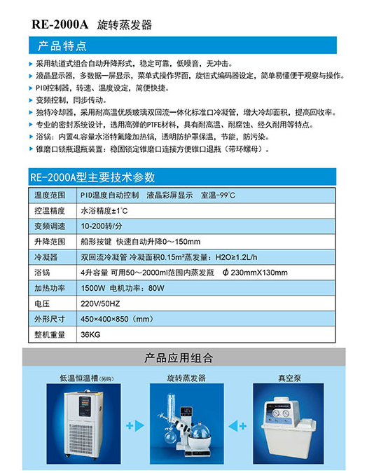 旋转式蒸发器是采用旋转蒸发瓶(烧瓶),增大蒸发面积在减压下置于水浴中一边旋转,一边加热的装置,使瓶内溶液扩散蒸发。是化学工业,医药工业,高等院校和科研实验室等单位用于制造及分析实验赖以浓缩,干燥,回收等较为理想的必备基本仪器。