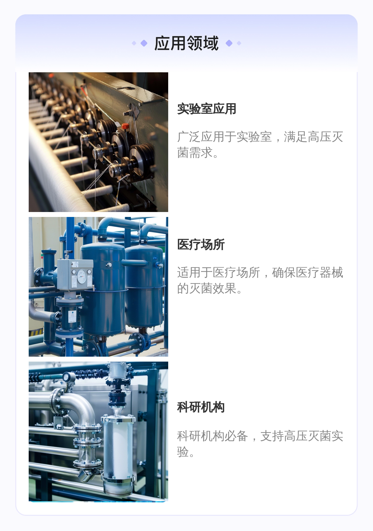 实验室、医疗、科研等需要高压灭菌的场所 |