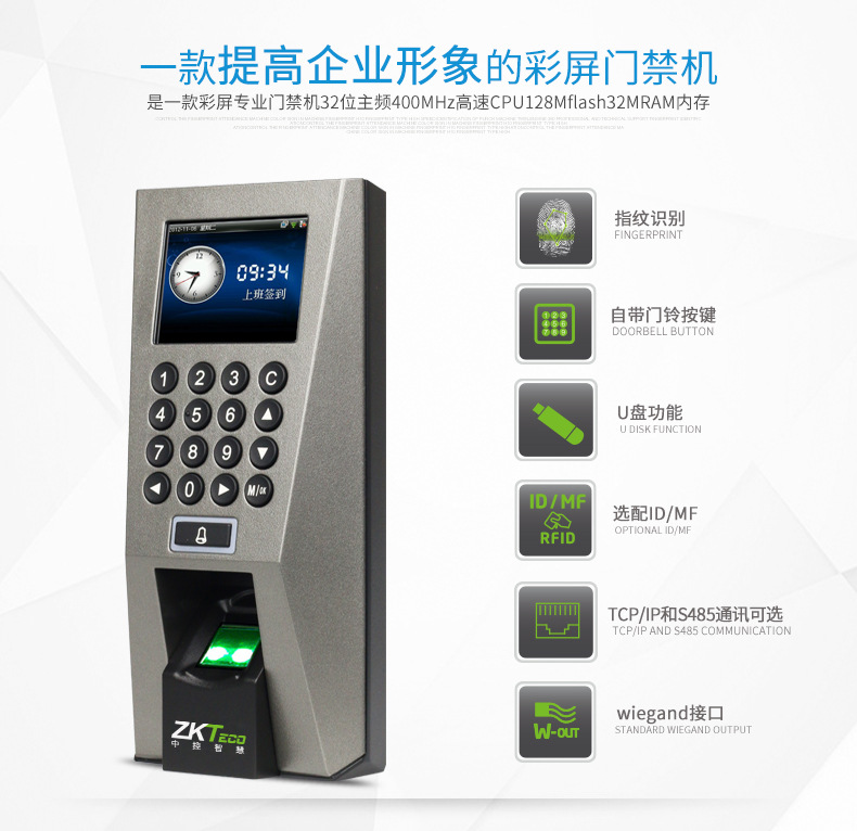 .F18是中控科技推出的一款彩屏指纹门禁一体机,32位主频400MHz 高速CPU ,128M flash 32M RAM内存,该产品采用高贵典雅的欧美设计风格,设计上严格遵循国家安全防范产品标准,采用大量进口元器件,出厂经过严格的老化测试,产品稳定可靠。该产品同时具有TCP/IP及RS485通讯方式,满足各种不同的网络环境,适合于小型办公环境、企业内部等场所。