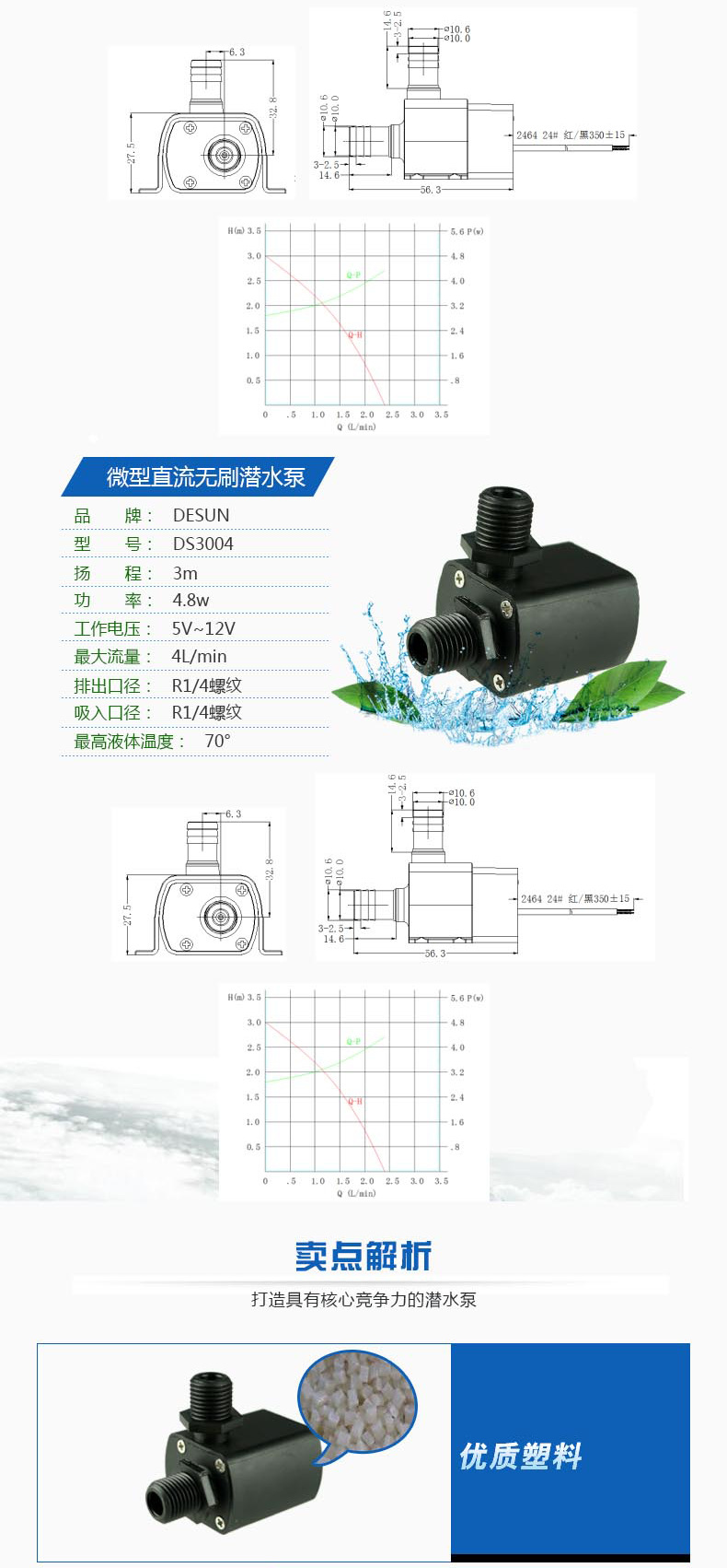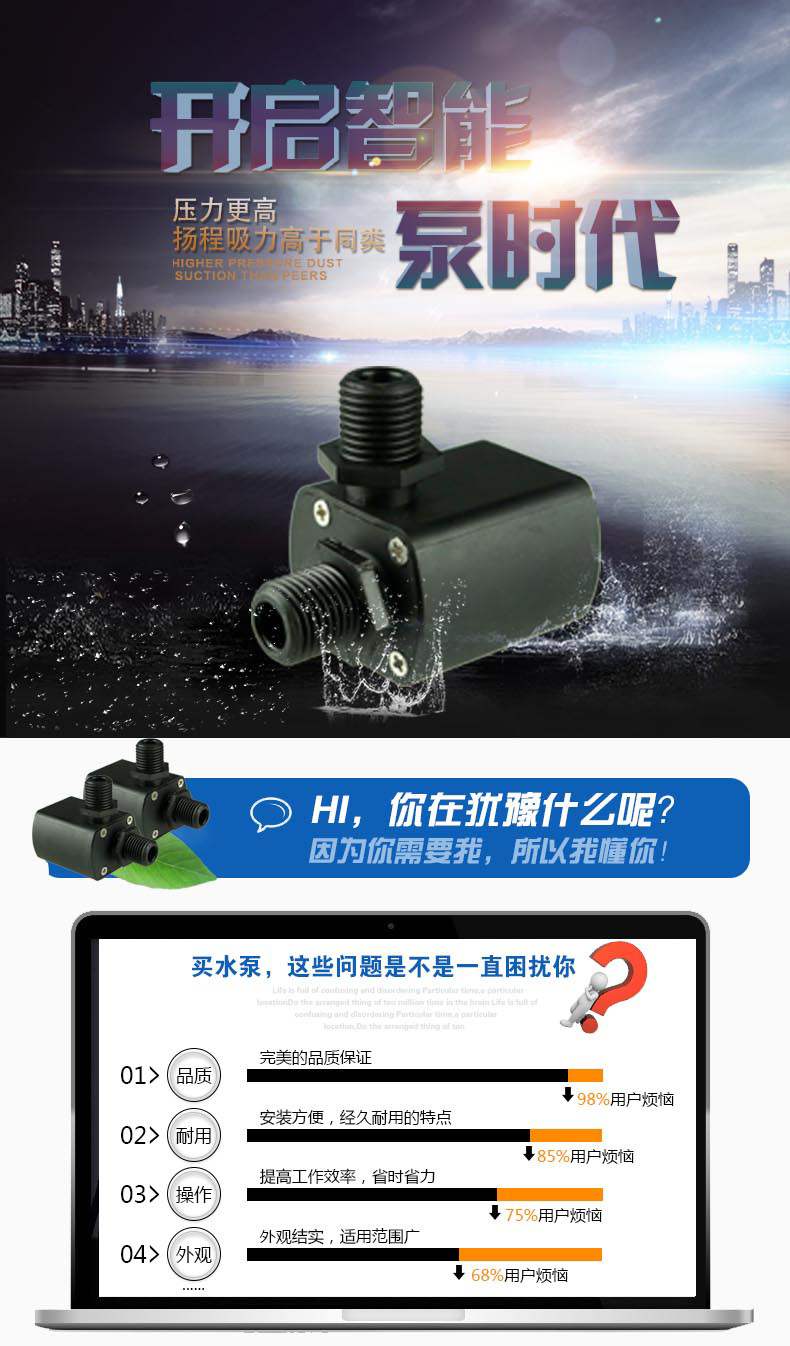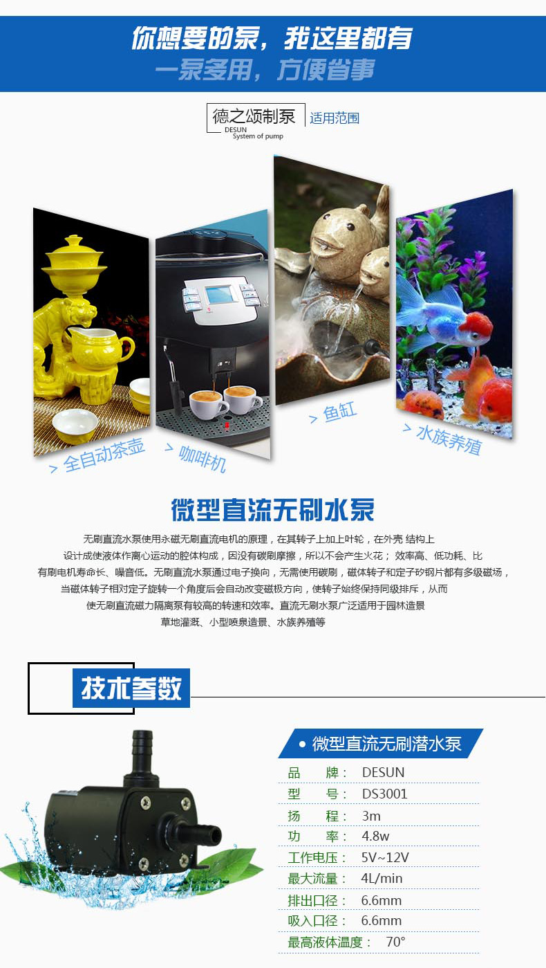 12v微信无刷小水泵,适用于,水族养殖、太阳能水循环系统、水床、沐足、无土栽培、小型喷泉等 ,可按要求定制多种保护,堵转保护,极性反接保护,水陆两用,寿命延长,可连续运行20000小时,无需保养,环氧树脂灌封,IP68防水等级