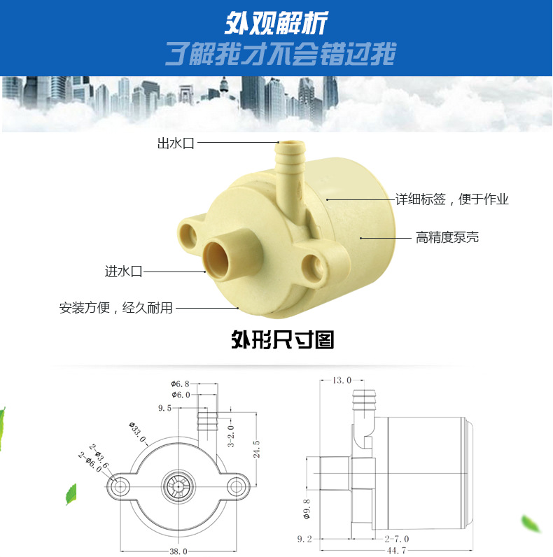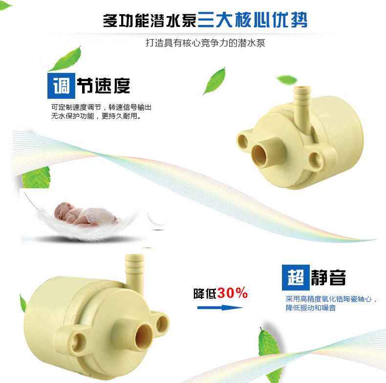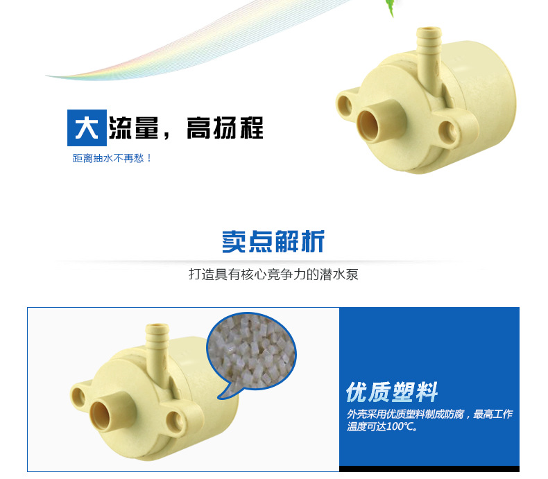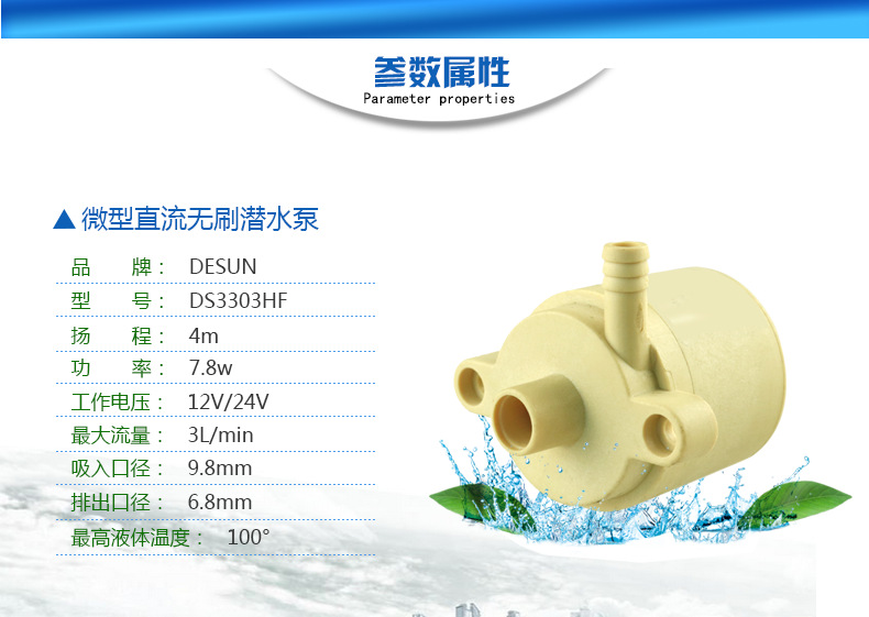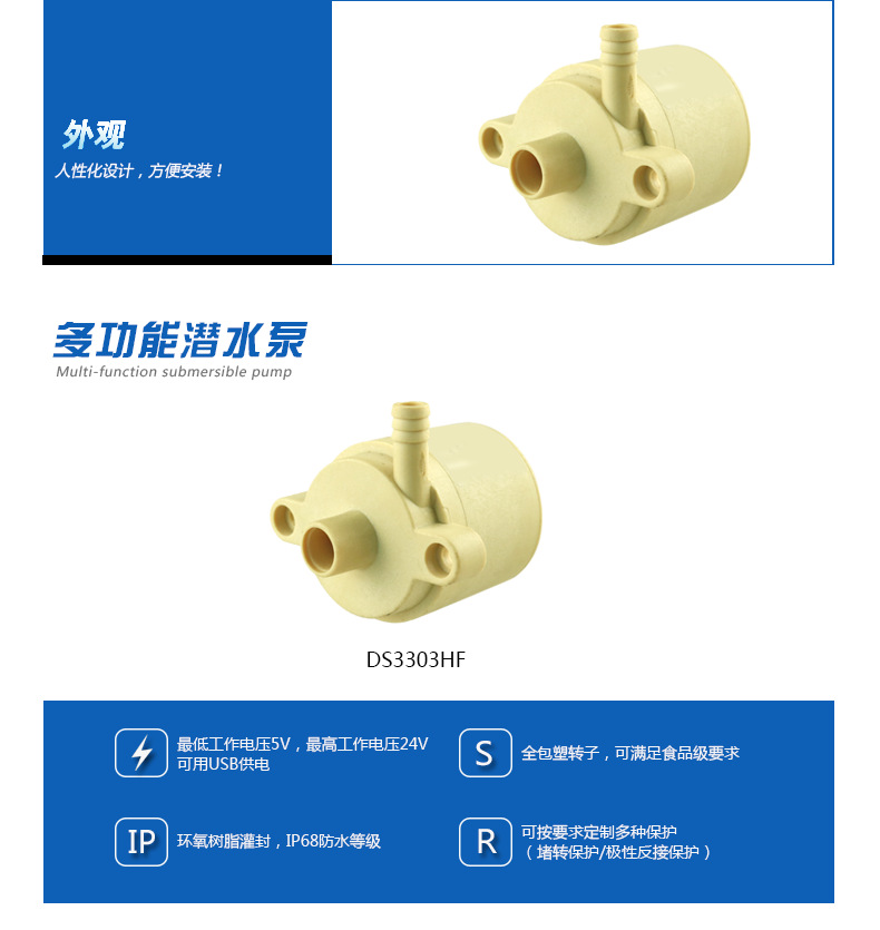 DS3303HF耐高温食品级微型水泵,电压5v-24v扬程4米、结构设计无自吸功能,体积小,安装方便,效率高、功耗低、寿命长达20000小时,无需保养,工作温度100℃,电机的定子和电路板采用环氧树脂灌封,并与电子完全隔离,IP68防水等级,解决了电机式直流水泵长期潜水产生的漏水问题,水陆两用,可潜水,可不可潜水(安装位置要在液体以下