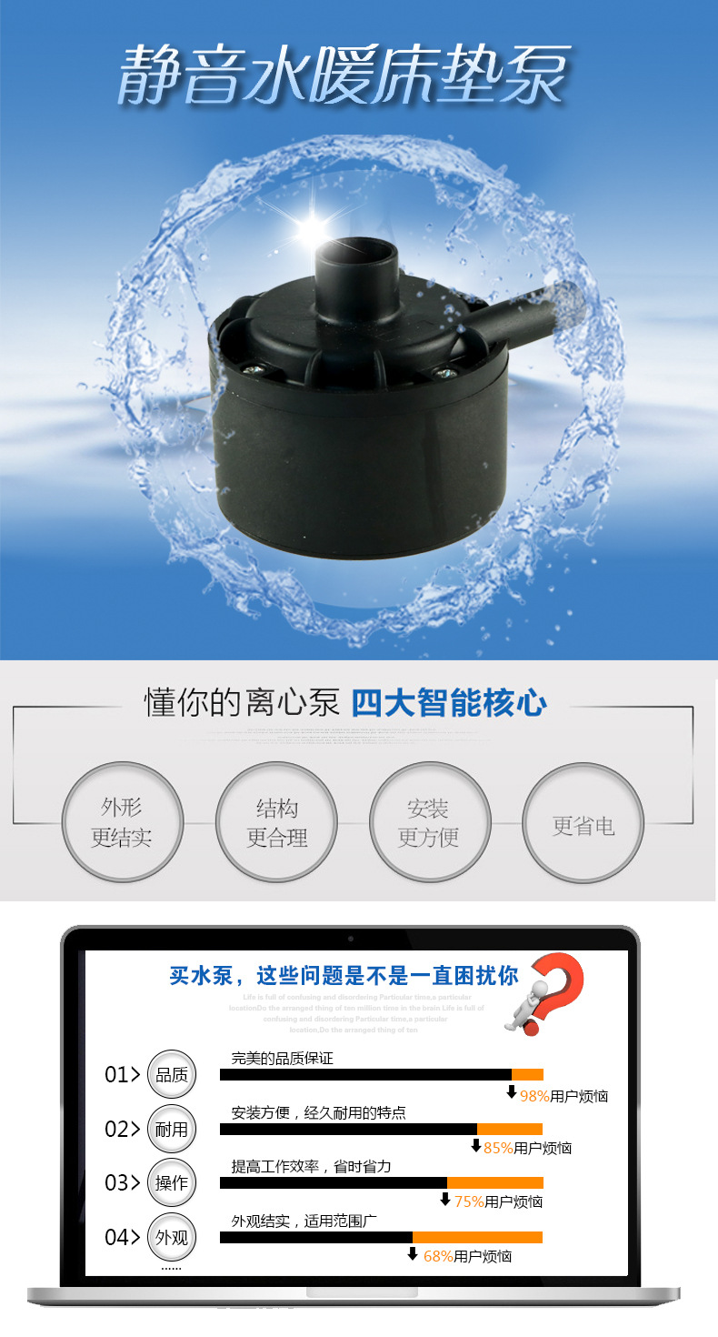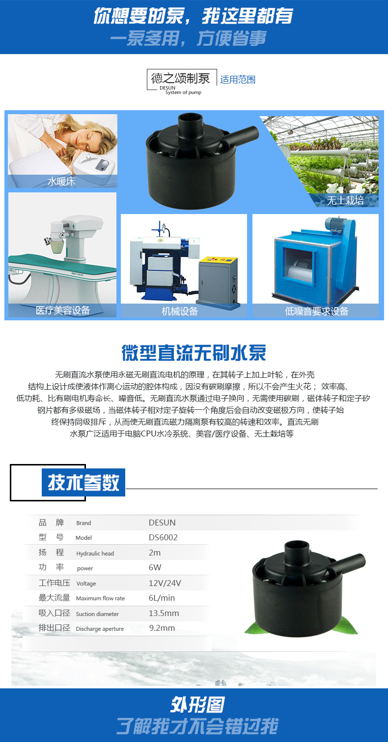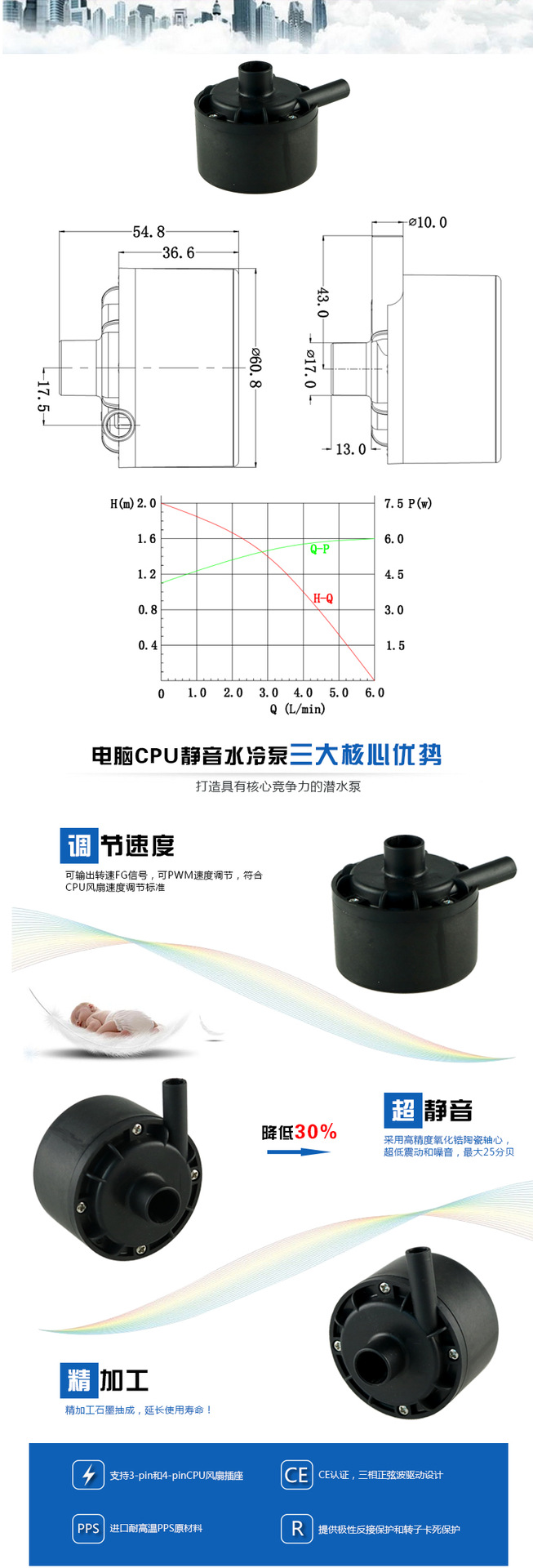 超静音12v耐高温直流水泵DS6002扬程2米、高工作温度100、结构设计无自吸功能,CE认证,三相正弦波驱动设计,采用高精度氧化锆陶瓷轴心,减少震动,精加工石墨轴承,延长使用寿命
