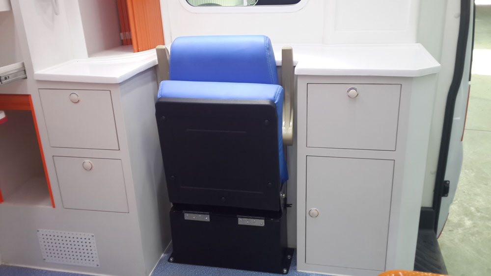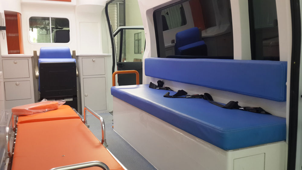 福特全顺救护车医疗舱右侧安装独立长条座柜:带舒适背、座皮垫及安全带,柜内为铲式担架1套。