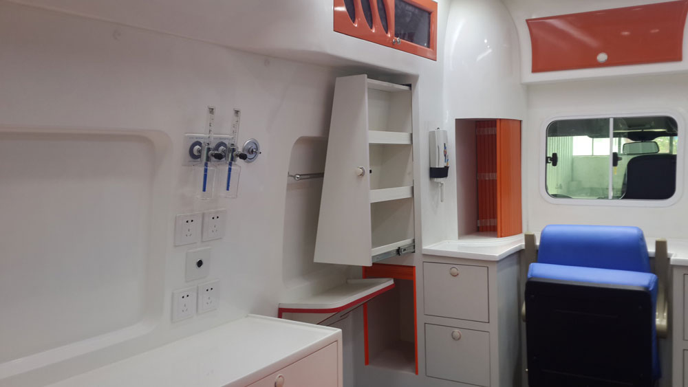 福特全顺救护车医疗舱左侧长条柜:台面可固定急救设备 (可用于心电图、呼吸机、除颤仪等仪器存放),舱内侧壁安装墙式氧气吸入器2套。