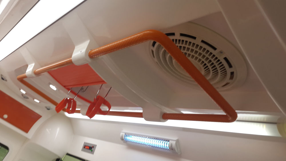 福特全顺救护车医疗舱安装顶安装1套椭圆形顶置扶手杠,电动换气扇1套,2只输液支架,1只12V紫外线消毒灯,2只长条LED照明灯,4只圆形LED射灯,控制面板一套。