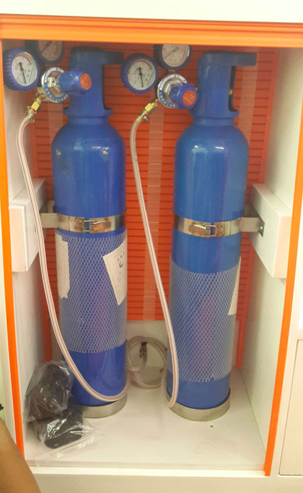 福特全顺救护车医疗舱左后部安装10升氧气瓶2只及氧气瓶固定支架,氧气管采用金属管:连接处使用金属螺母锁紧,带减压阀、快速转化。
