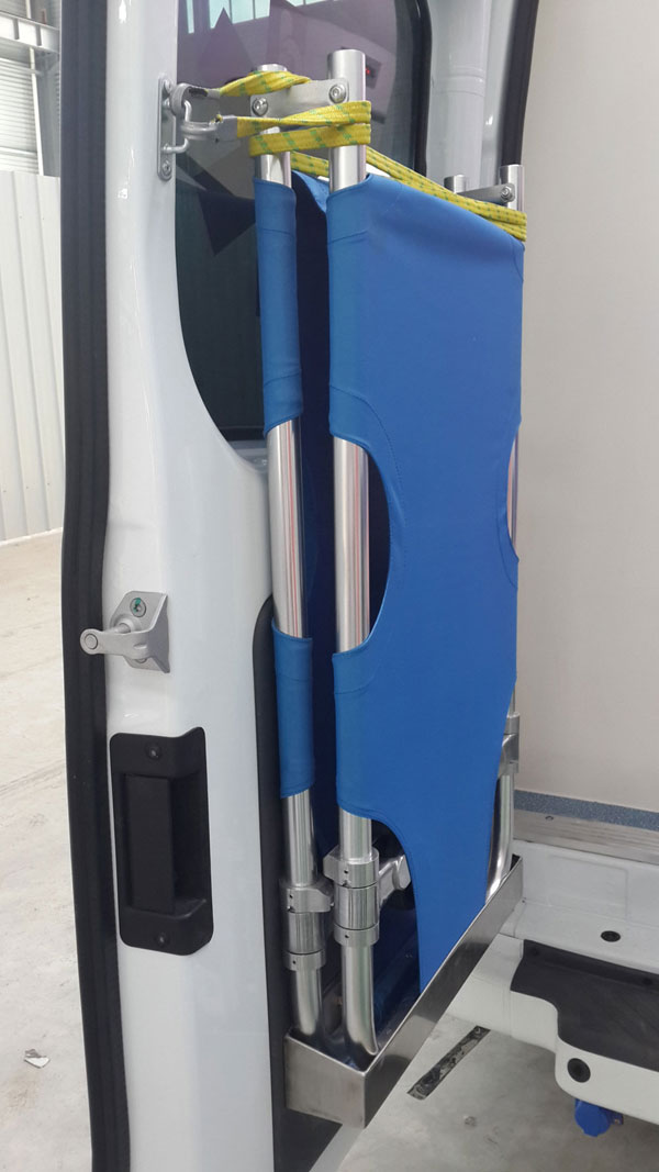 福特全顺救护车侧门、后门上车头部防撞保护,左后门带一套折叠担架。