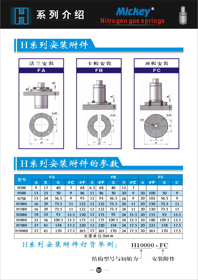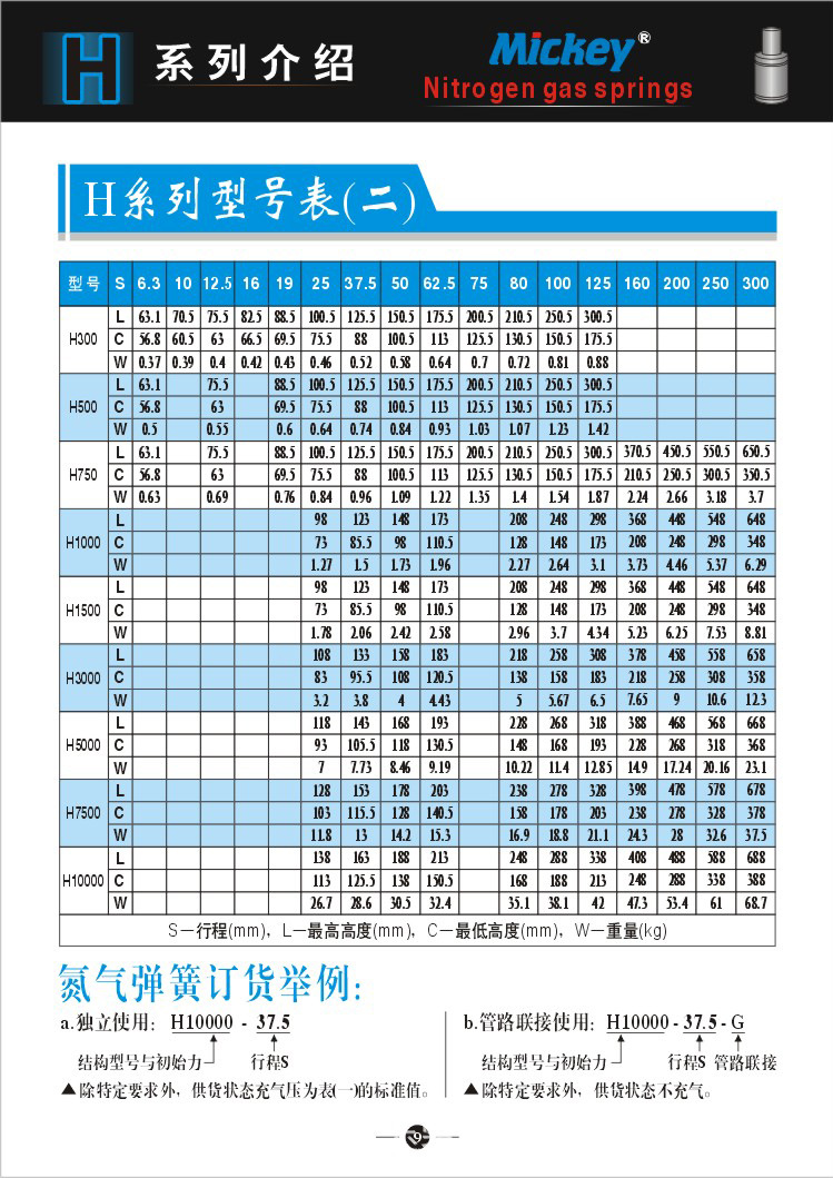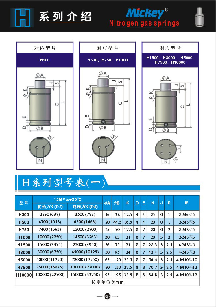 H系列简介:H系列是氮气弹簧中结构较紧凑的产品,缸筒长度较短,占用空间少,可节省模具体积,是可维修型。该类型可单只独立使用,也可用管路联接组成系统使用而且弹压力可通过管路系统进行调节。该产品广泛应用于金属冲压、成型、汽车制造、注塑模具、机械设备等领域。