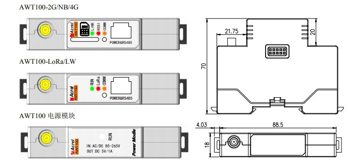 ■ AWT100-LW 无线通信终端的功能目前还在开发中,未来可实现通过 LoRa 通讯将数据上传至服务器。 注:①AWT100-2G/NB/4G 无线通信终端能通过安科瑞平台协议与安科瑞服务器通讯。