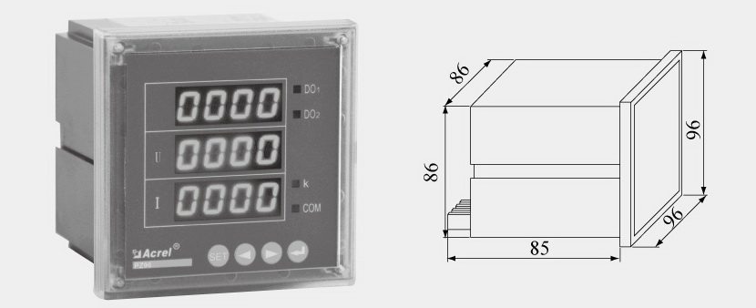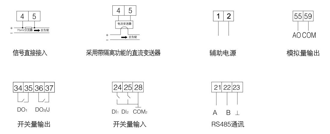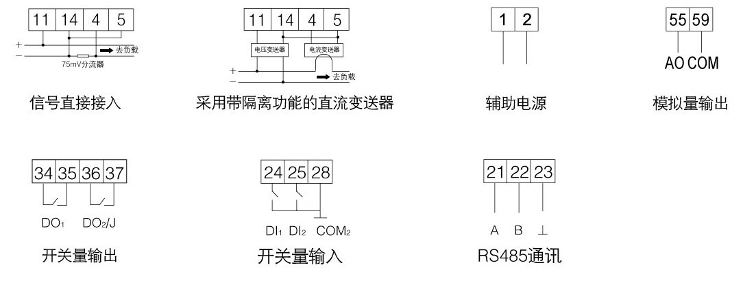 2.4.3 96B型产品规格 ●功能一览表 注:J(继电器越限报警输出)与第二路开关量输出复用。 ●外形及尺寸(mm) 2.5 接线端子 2.5.1 72、80、、96、96B型产品 ●电流表