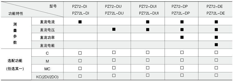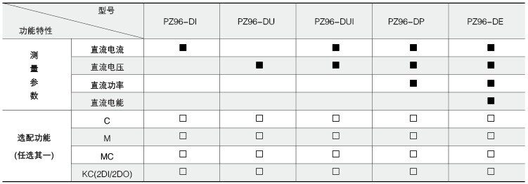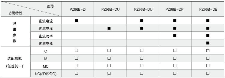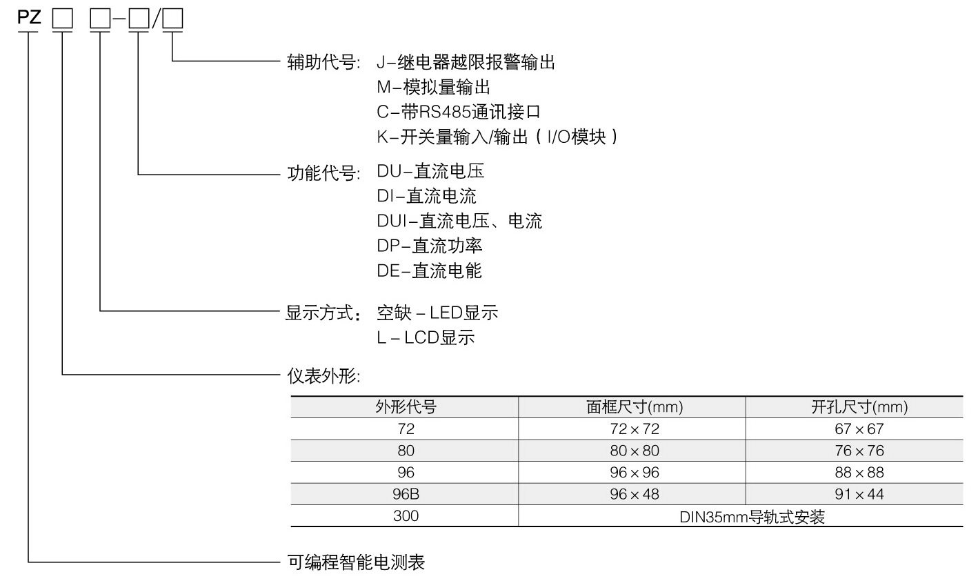 | 1 PZ系列直流检测仪表 1.1 概述 PZ系列直流电测仪表是针对直流屏、太阳能供电、电信基站等应用场合而设计的,该系列仪表可测量直流系统中的电压、电流、功率、正向与反向电能。既可用于本地显示,又能与工控设备、计算机连接,组成测控系统。 仪表可具有RS-485 通讯接口,采用Modbus-RTU 协议;可带模拟量输出、继电器报警输出、开关量输入/输出。根据不同要求,通过仪表面板按键,对变比、报警、通讯、开关量输出进行设置与控制。 1.2 型号说明