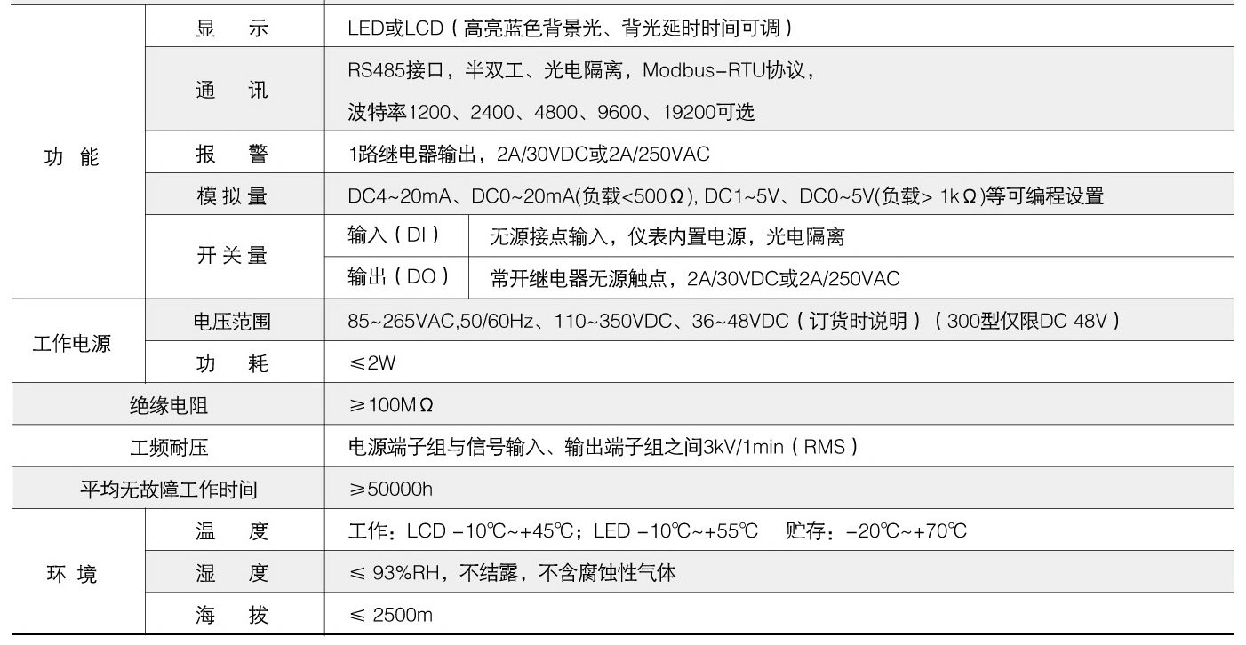 1.4 产品规格 1.4.1 72型产品规格 ●功能一览表 注:J(继电器越限报警输出)与第二路开关量输出复用。 1.4.2 80型产品规格 ●功能一览表 注:J(继电器越限报警输出)与第二路开关量输出复用。 ●外形及尺寸(mm)