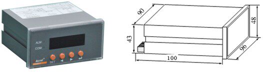 1.4.3 96型产品规格 ●功能一览表 注:J(继电器越限报警输出)与第二路开关量输出复用。 ●外形及尺寸(mm)