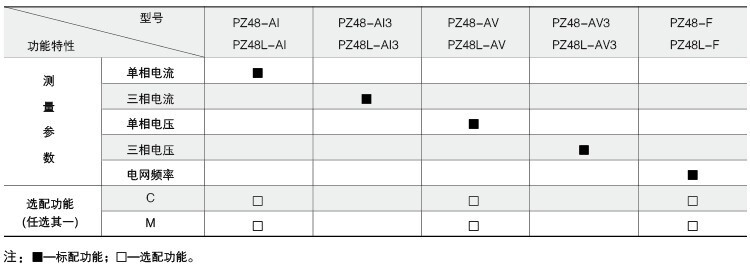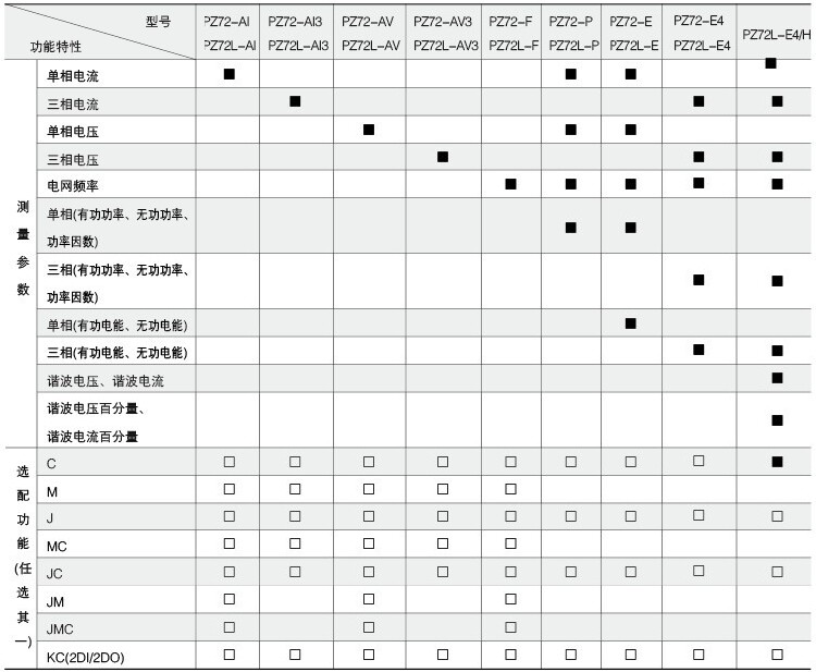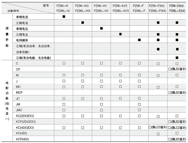 2、PZ96(L)-E3(4)在选配KC(4DI)功能时具备1路有功电能脉冲信号输出端口,在选配KC(2DI/2DO、4DI/2DO)功能时无脉冲信号输出端口;