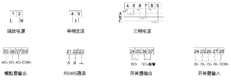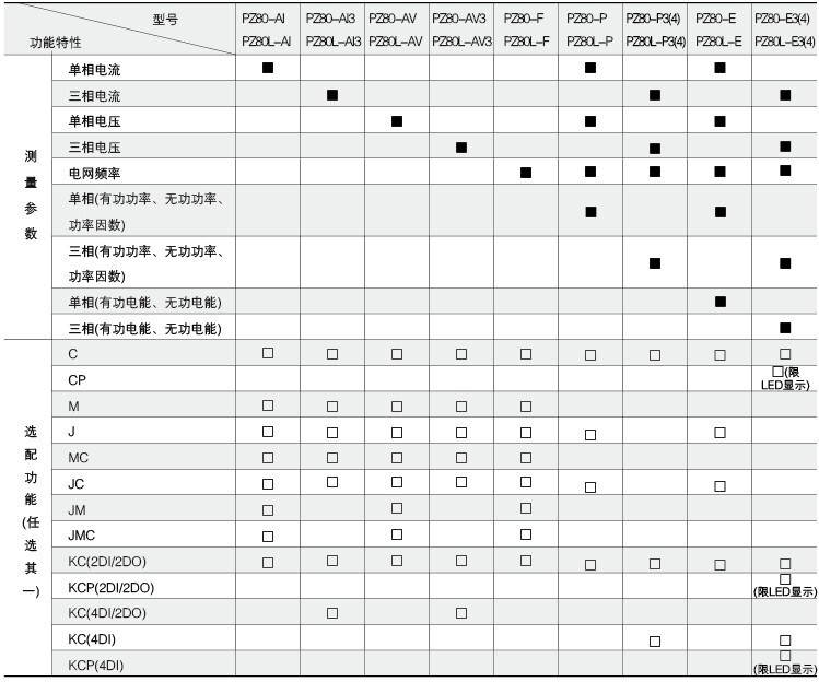 3、PZ80(L)-E3(4)在选配KC(4DI)功能时具备1路有功电能脉冲信号输出端口,在选配KC(2DI/2DO、5DI/2DO)功能时无脉冲信号输出端口;