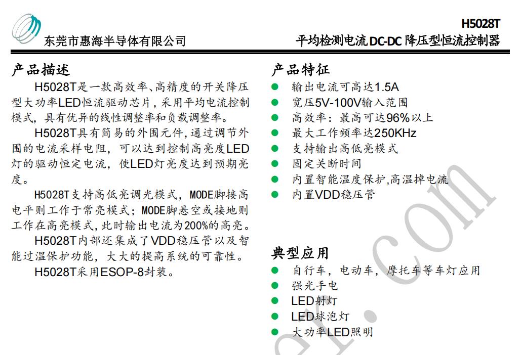 H5028T降压恒流芯片 12V-48V/6.2V0.6mA柜内照明灯IC方案
