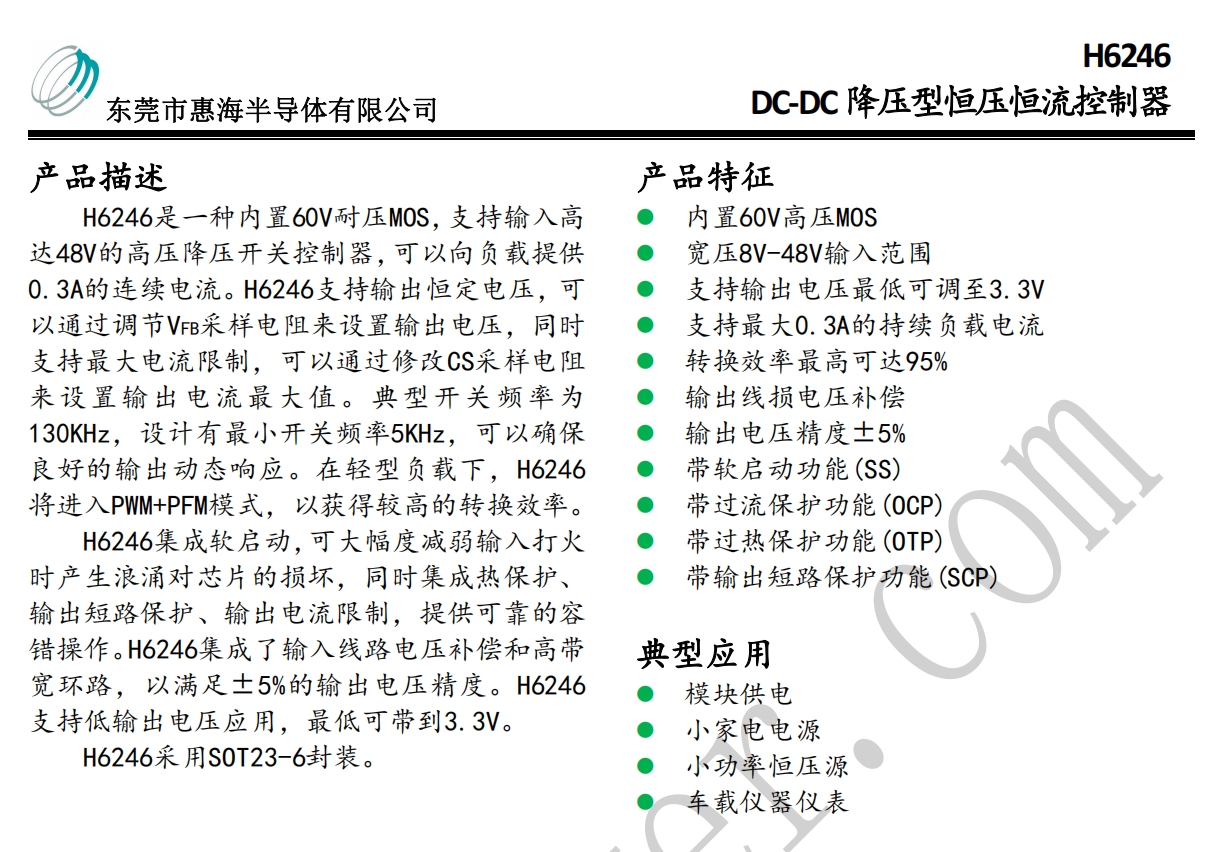 H6246降压恒压芯片 48V转5V300mA汽车传感器方案 SOT23-6封装