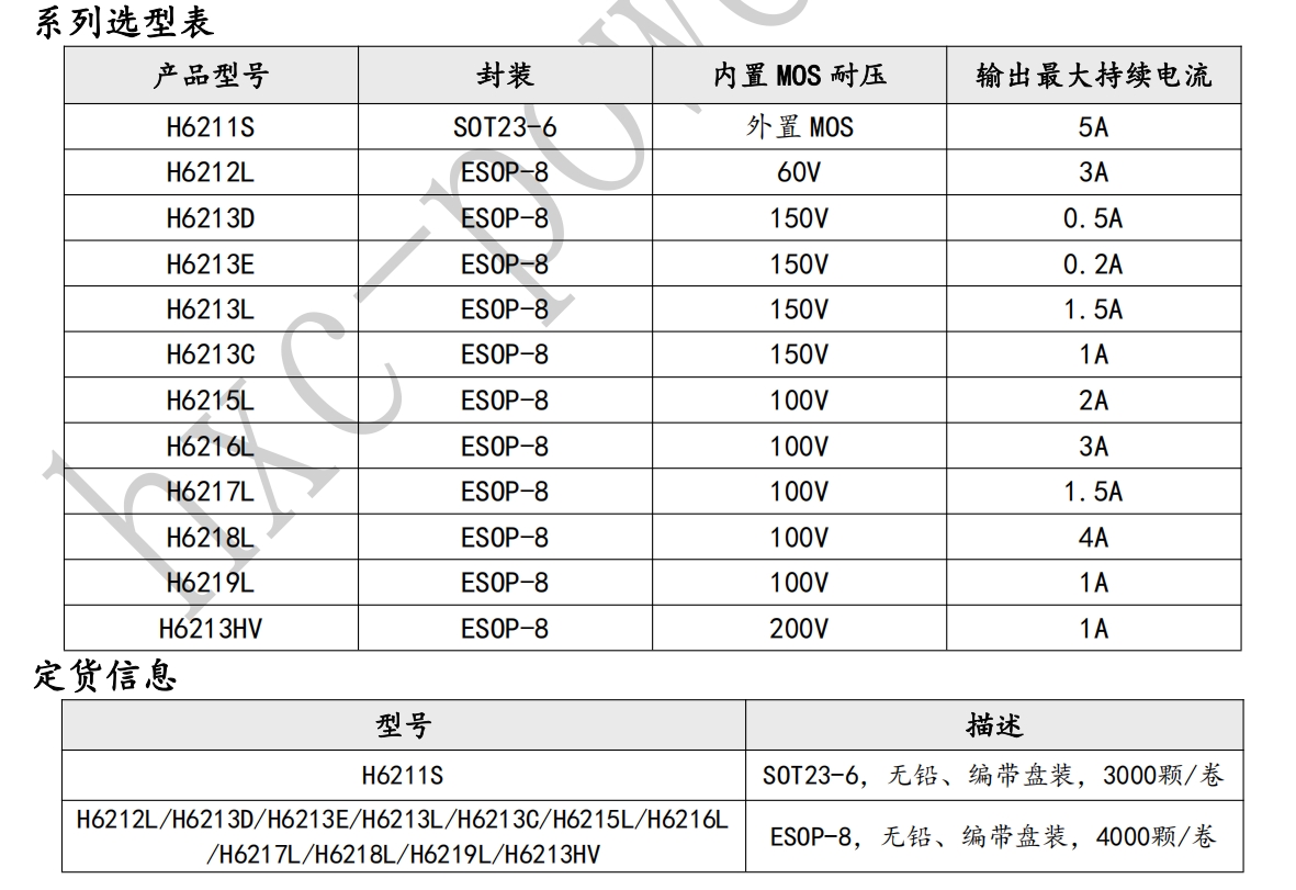 H6212L采用ESOP-8封装,芯片底部设计有功率散热焊盘,连接芯片的VIN输入端及内置MOS漏极,可以有效的帮助芯片加大散热。
