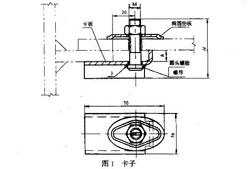 卡子由卡板、椭圆垫板、圆头螺栓和螺母组成,其结构、尺寸及材质等如上图。