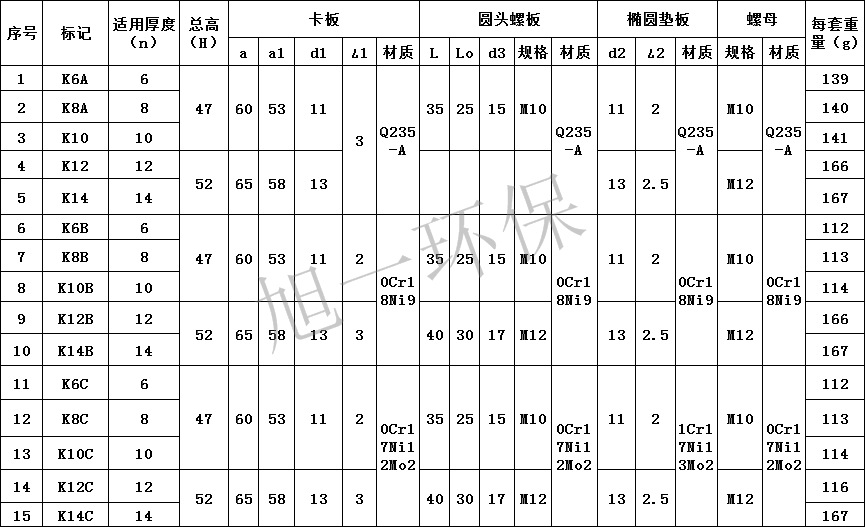 K表示“卡子”;6,8,10,12,14分别表示卡子的适用厚度为6,8,10,12,14mm;