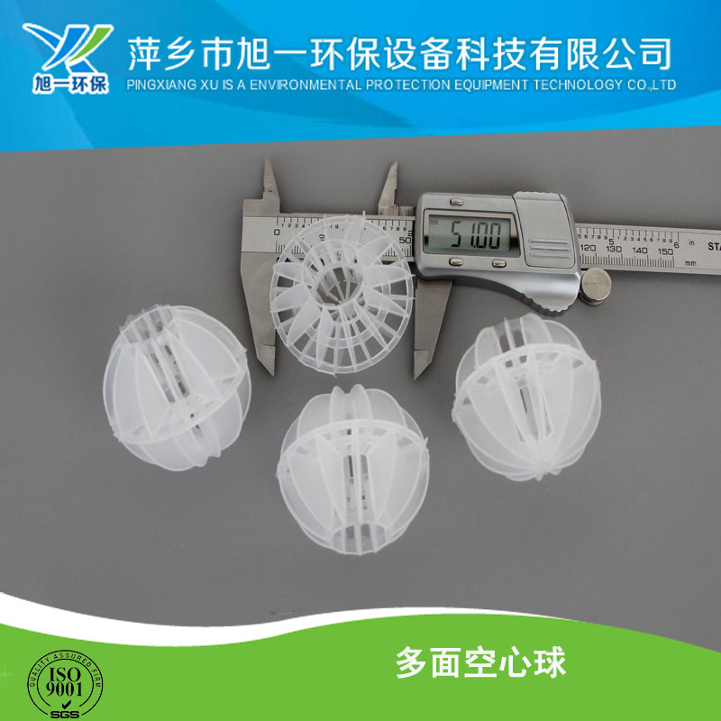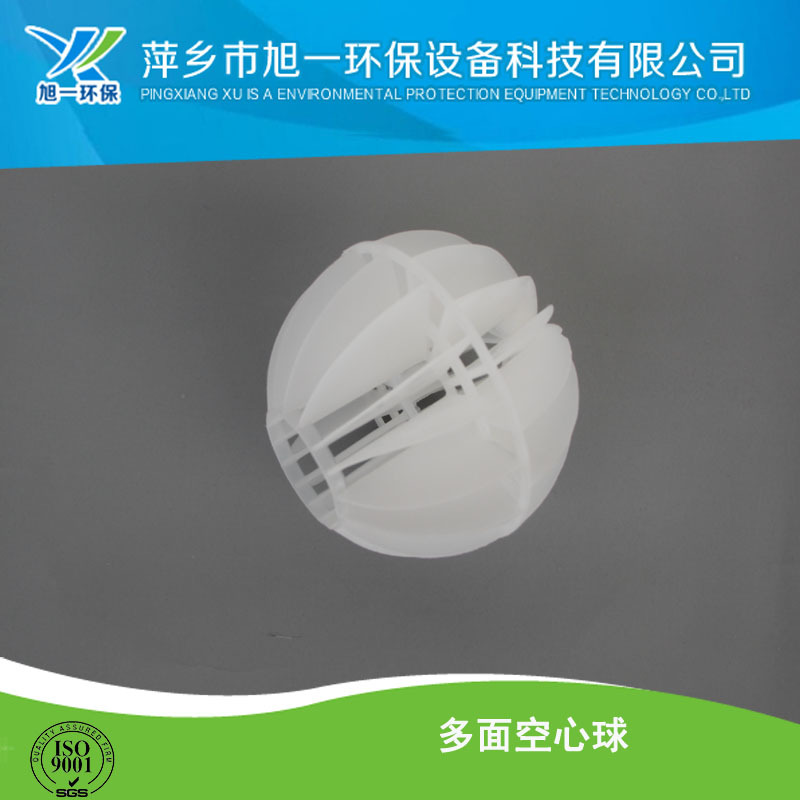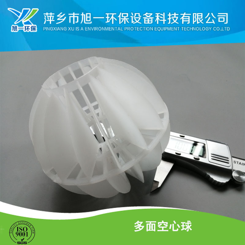 多面空心球采用聚丙烯塑料制成球状,由两个半球合成一个球形,每个半球上开有12个半扇形叶片,两个半球的扇形叶片相互错开,多面空心球的中部沿整个周长有一道加固环,在环的上下各有十二片球瓣。上下球瓣互相交错,沿中心轴呈放射形布置。但是由于叶片数偏多,彼此间有遮蔽效应,不利于液体分布和润湿;液体大多在球体空心柱聚集,阻碍气体畅通,因此阻力较大。 该填料的特性是低压降,通量大,效率高,高的弹性,填料层内流体再分布性能好。此种填料多用于水处理工程。