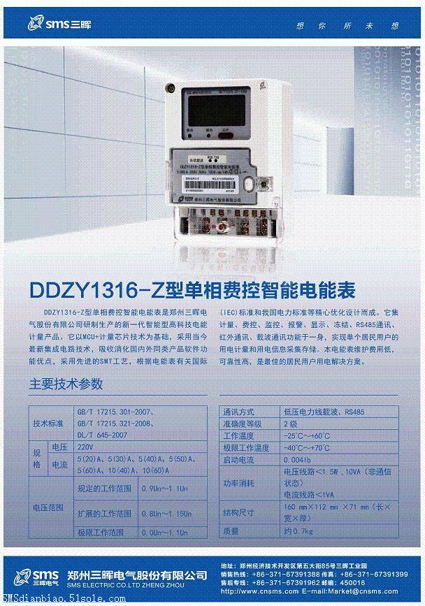 DDZY1316-Z型单相费控智能电能表是郑州三晖电气股份有限公司研制生产的新一代智能型高科技电能计量产品。它以MCU+计量芯片技术为基础,采用当今新集成电路技术,吸收消化国内外同类产品软件功能优点,采用先进的SMT工艺,根据电能表有关国际(IEC)标准和我国电力标准等精心优化设计而成。它集计量、费控、监控、报警、显示、冻结、RS485通讯、红外通讯、载波通讯功能于一身,实现单个居民用户的用电计量和用电信息采集存储。本电能表维护费用低,可靠性高,是佳的居民用户用电解决方案。