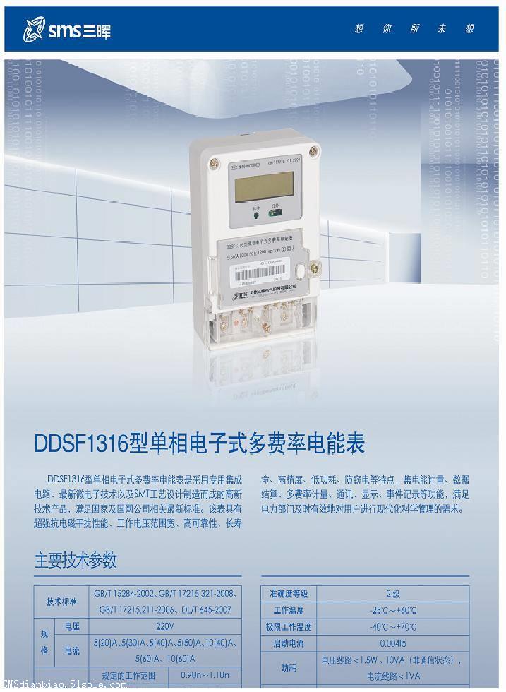 DDSF1316型单相电子式多费率电能表,又称单相分时表、单相农网表,其是郑州三晖电气股份有限公司采用先进的单片机处理系统设计而成,具有电路简单、可靠性高、成本低廉等优点。该产品软件、硬件、结构设计技术先进,计量精度高,结合单片机资源,实现电能分时计量,具有红外及RS-485通信功能,抗干扰、防攻击性能好,工作温度范围宽,能长期稳定可靠工作。该产品各项性能指标符合国家GB/T 17215.321-2008《1级和2级静止式交流有功电能表》、GB/T 15284-2002《复费率(分时)电能表特殊要求》、DL/T645-1997《多功能电能表通信规约》等标准的技术要求。