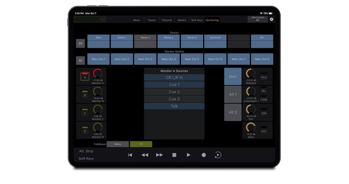 分配和管理任何启用了EUCON的监视系统中的监视控件,以及Pro Tools和其他DAW中的监视源。控制音源选择、扬声器剪辑、对讲和提示。您甚至可以将界面的某些部分锁定到监视应用程序,以进行专门的监视器控制,同时将另一个DAW与其余控件混合使用。