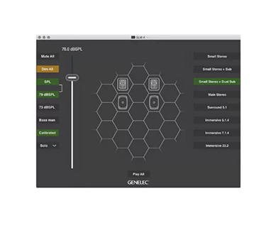 从单声道、立体声、沉浸式三维声系统,到超过80只监听音箱组成的复杂的实验性系统,真力GLM都能够将整个系统内的SAM系列音箱“一键自动校准”。校准后,您将能够直观、便捷地使用鼠标或触摸屏控制整个系统及每只音箱的关键参数:如音箱电平,监听电平,Solo(独听)、Mute(静音)、整体高频滚降,甚至根据不同工作需求设置特殊频响曲线(如X曲线)等。