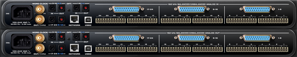 24Ai提供24个平衡模拟输入,24Ao提供24个模拟输出。加上3组8通道ADAT光纤传输,每个机型可多达72通道(24模拟,48光纤)。模拟通道支持多通道DB-25 D-sub接口及Phoenix接口的连接。