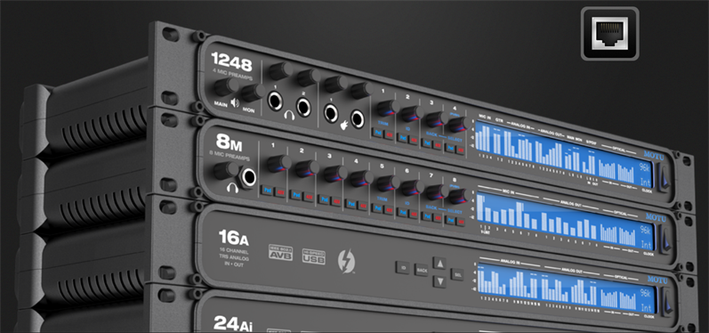 24Ai | 24Ao可由AVB以太网进行扩展,与其他MOTU AVB接口组成大型音频系统。