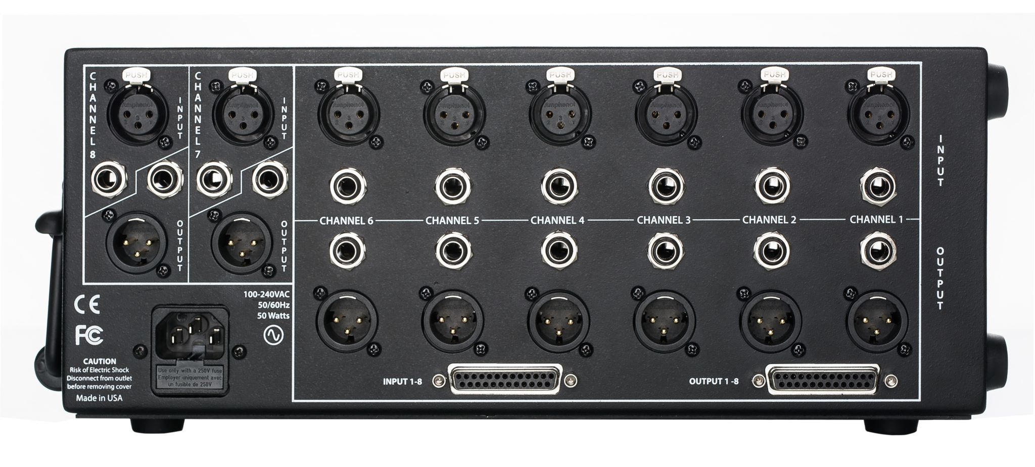 1-6通道平衡XLR/TRS输入输出,7-8通道直通平衡XLR/TRS输入输出,1-8通道DP输入输出