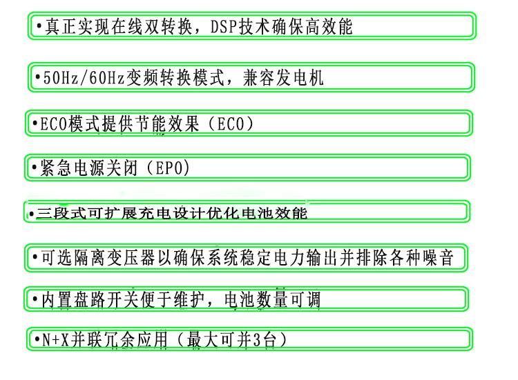 在线工作模式设计,高速的静态开关切换;智能数字化控制技术;高效的IGBT(Insulated Gate Bipolar Transistor)逆变技术;优越的负载特性;直观的LED状态指示;人性化的触摸屏大屏幕LCD中英文显示;完善的保护功能;高性能的动态特性;智能侦测功能;智能通讯