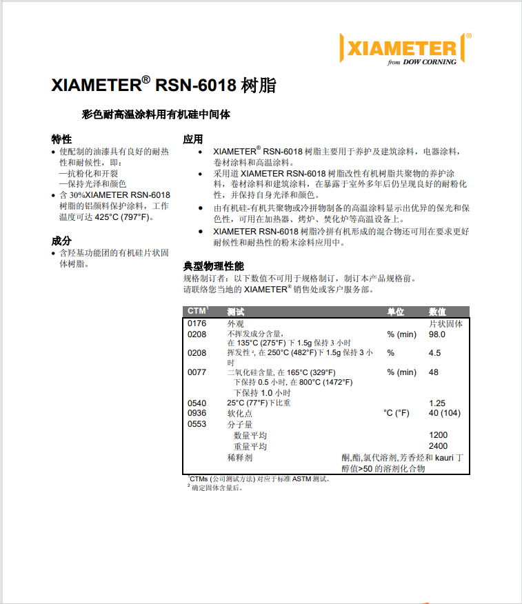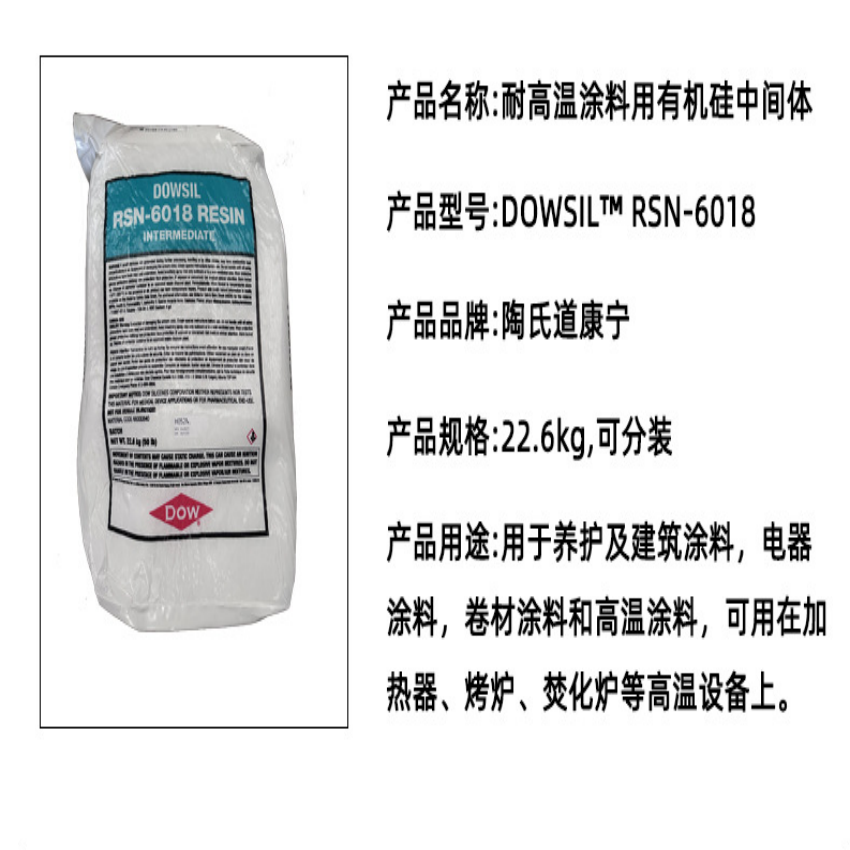? DOWSIL RSN-6018 Resin中间体冷拼有机形成的混合物还可用在要求更好耐候性和耐热性的粉末涂料应用中。