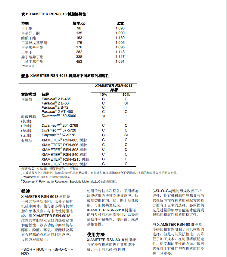 =SiOH + HOC= → =SI–O–C= + H2O 。使用传统技术和设备,采用溶剂法或熔融方法可完成该反应。钛酸酯类催化剂,如,四丁基钛酸酯,可加快共聚反应。DOWSIL RSN-6018 Resin还能与多种有机树脂冷拼,以提高耐候性和耐热性。使用前,应测试相容性。