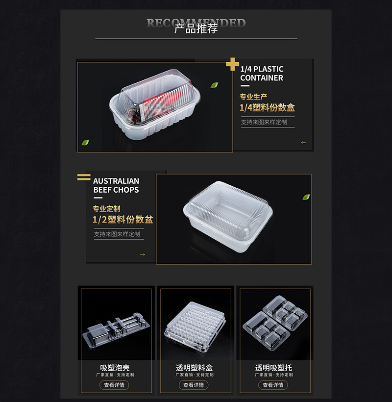 吸塑部使用PET、PVC、HIPS 、PP、BOPS、PS植绒、 ABS等多种材料,生产各种托盘、塑料盒、泡罩。例如: 植绒托盒、对折盒、三折盒、蔬菜沙拉盒、草莓盒、鸡蛋盒、折叠胶盒、透明圆筒。可作电子、玩具、文具、日化用品、工艺品、 食品、礼品、五金制品等包装之用。