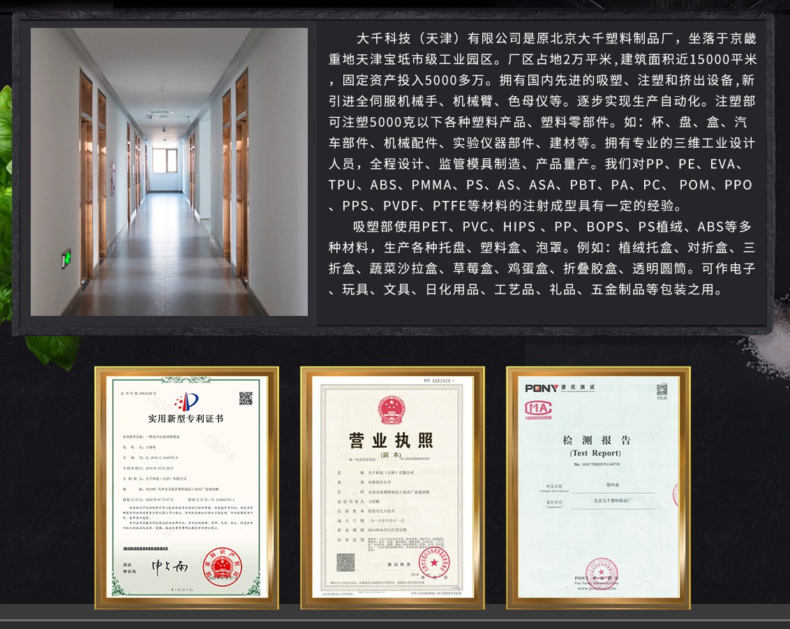 大千科技(天津)有限公司是原北京大千塑料制品厂,生产外迁升级扩建成立的生产基地。坐落于京畿重地天津宝坻市级工业园区,交通便利、环境优美。