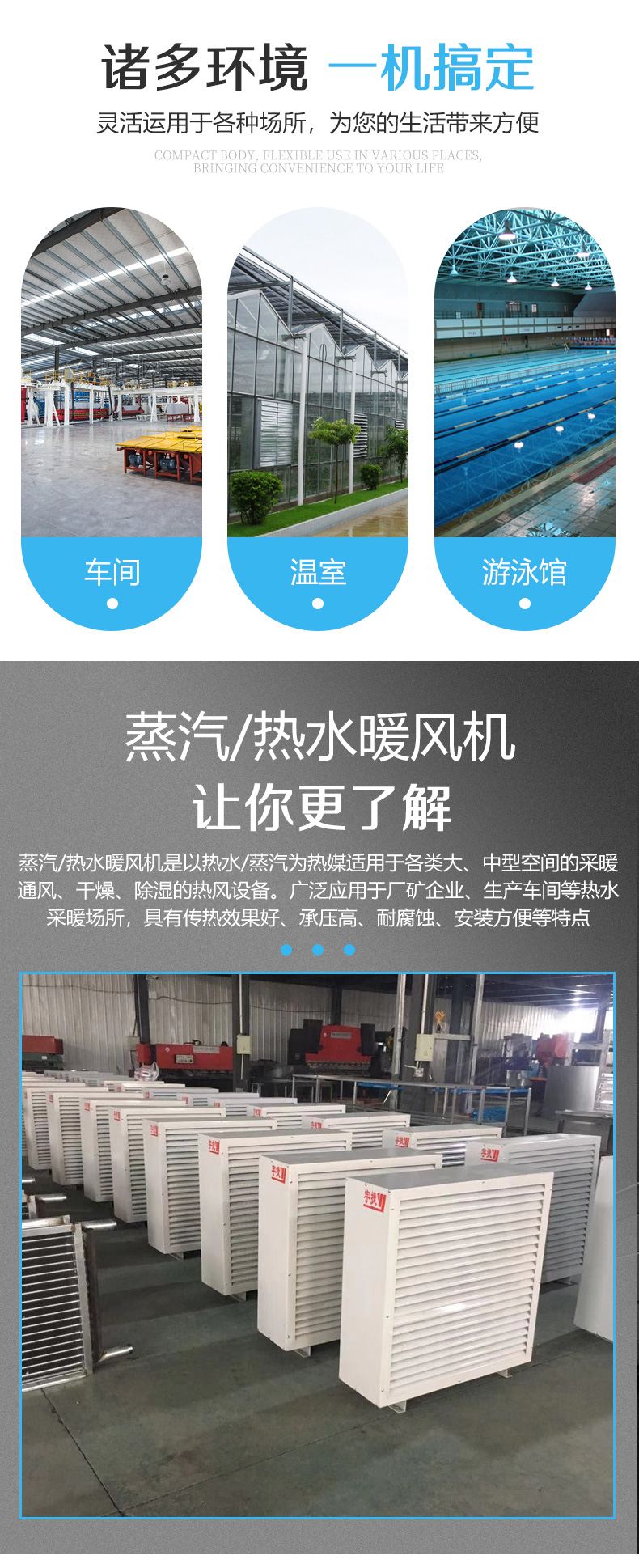 2. 风机: 风机是蒸汽暖风机的另一个重要组成部分。它主要用于吸入冷空气,然后通过加热器加热后,将暖空气吹入室内。