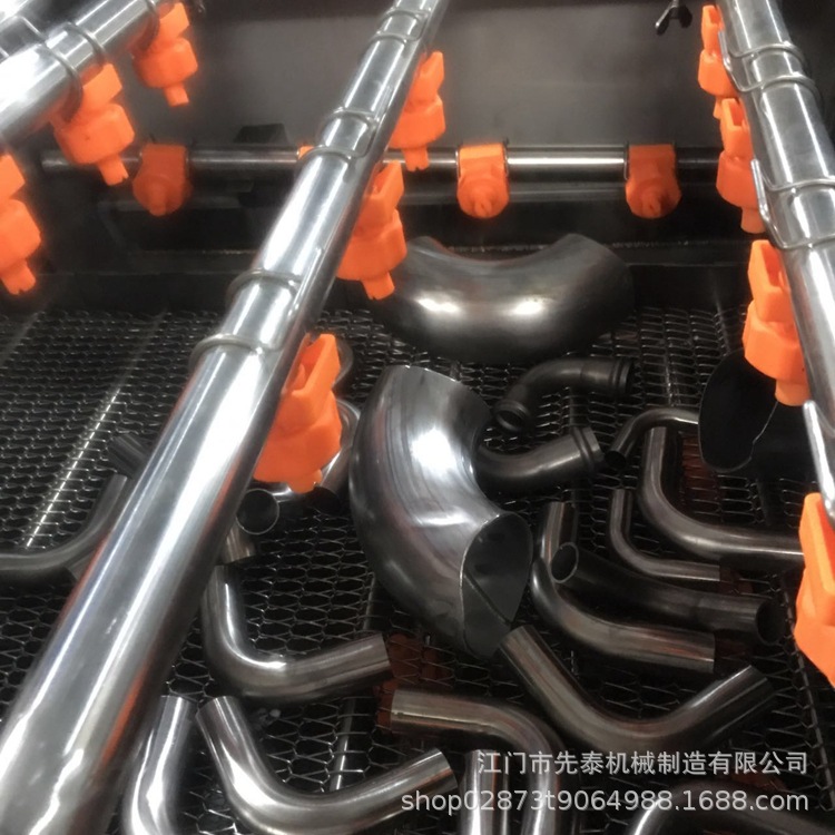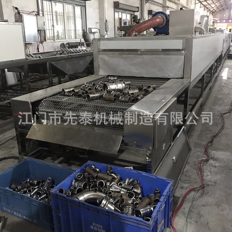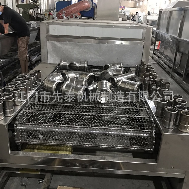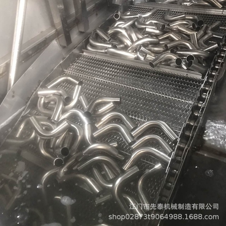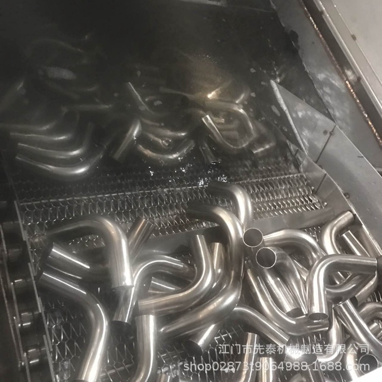 8、不锈钢水管清洗机 网带通过式三通弯头自动化除油清洗机自动化程度高、日清洗量大、清洗效果好、消耗低、人员用工少等。故而已经有越来越多的公司采用了这种高效益的设备来满足高产量和高品质的生产要求。