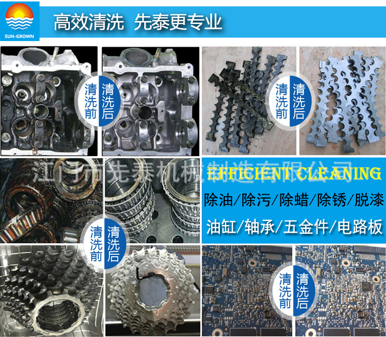 “先泰”牌清洗机广泛适用于电子行业、光学行业、核电行业、汽车行业、电镀行业、离子镀膜行业、钟表行业、化纤行业、机械五金行业、医疗行业、珠宝行业、彩管行业、轴承行业等领域。本公司生产的超声波清洗机经用户的使用而得到了认可和好评。在多个行业内均有成功案例可供参考:陕西咸阳彩虹集团公司、广东福地彩色显示像管股份有限公司(清洗显像管零件)、松下电器(周转箱清洗机)、科龙电器(周转箱清洗机)、厨邦酱油(周转箱清洗机)、广东富华机械有限公司(自动清洗烘干线)、武汉东江汽车配件有限公司(清洗周转箱)、云南光学仪器厂(清洗光学玻璃)、中日合资彩虹樱光公司(清洗电子枪零件)、美资康顺光通讯有限公司(清洗晶片)、台商缘而美珠宝首饰厂(清洗珠宝首饰)无锡小股份有限公司(清洗线路板)、广东邦克厨卫有限公司公司(清洗不锈钢水槽)、浙江台州博朗厨具有限公司(不锈钢水槽清洗烘干线)、宁波以赛亚集团(清洗机活塞)等大型厂家广泛使用。