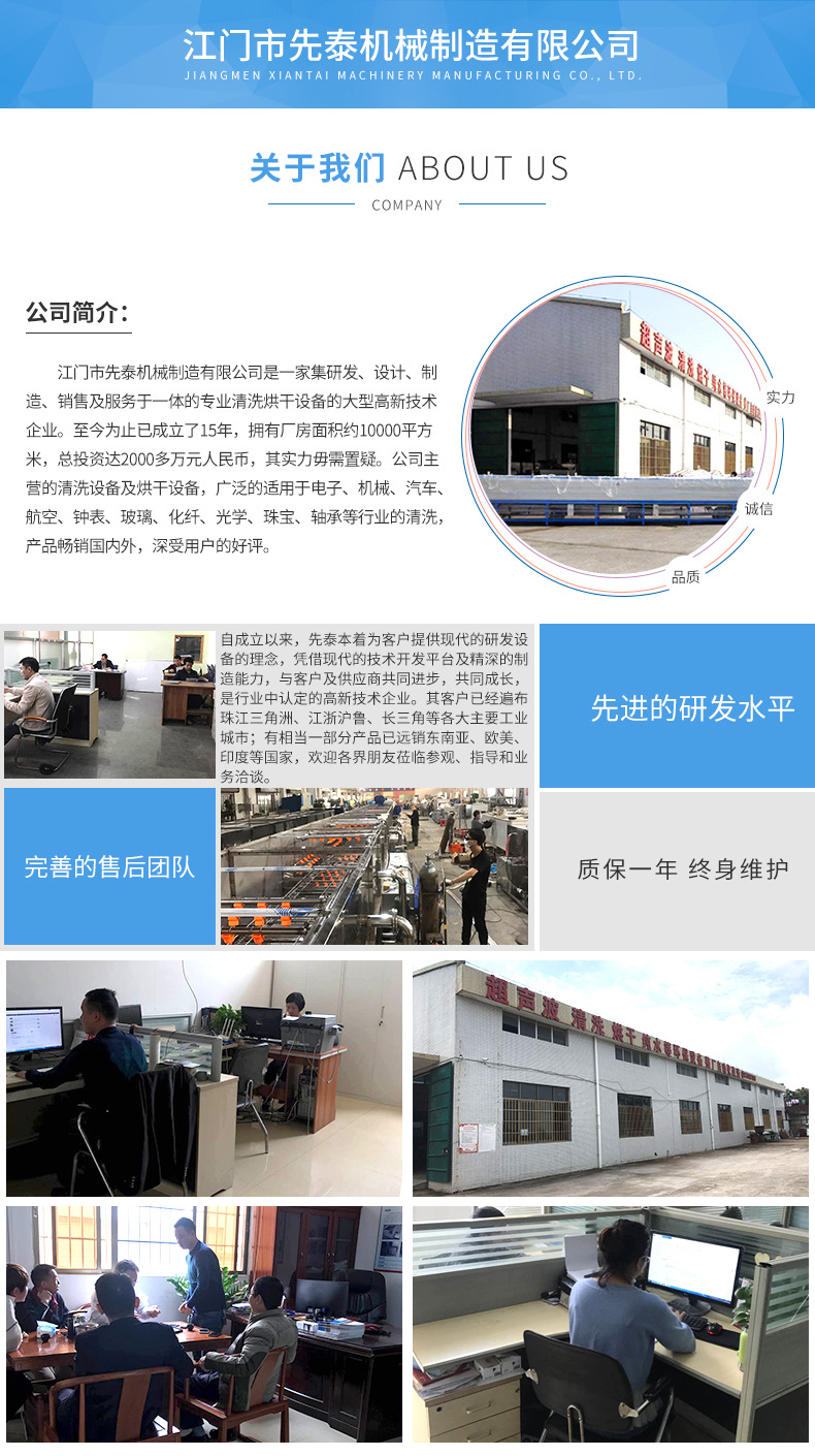 江门市先泰机械制造有限公司坐落在美丽富饶的中国侨都江门鹤山市共和镇,是一家大型研发、生产、销售超声波清洗设备、烘干设备、纯水设备、输送设备、其他环保设备以及整厂自动化改造的机械设备公司。产品包括超声波清洗设备(单槽超声波清洗机、多槽超声波清洗机、全自动超声波清洗流水线、机械臂式全自动超声波清洗机等)、高压喷淋清洗设备(网带式喷淋清洗机、悬挂式喷淋清洗线、掀盖式单槽喷淋清洗机等)、烘干设备(单层或多层网带式烘干机、隧道式烘干设备、布匹烘干设备、工业烤箱、高温烘房、低温农副产品烘房等)、工业纯水设备、各类非标型输送设备等。