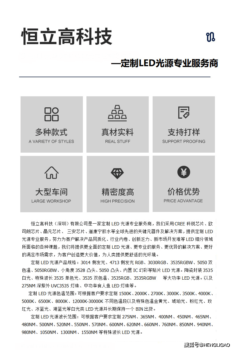恒立高科技(深圳)有限公司是一家定制LED光源服务商,我们采用CREE科锐芯片、OSRAM欧司朗芯片、EPISTAR晶元芯片、 SANAN三安芯片、Dow Corning道康宁胶水等全球先进的关键元器件及解决方案,提供定制LED光源服务,努力为客户解决产品同质化、行业内卷、创新乏力、新市场开发难等LED细分领域所面临的各种课题,我们将提供更全面的定制LED光源、更的服务、更优异的解决方案、更好的满足市场需求,为客户创造更大价值,为人类提供更舒适的光环境。