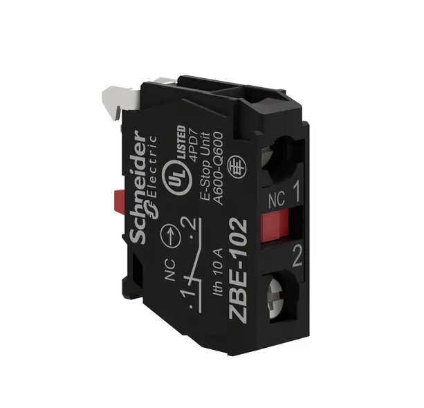?ZBE102是一个单触点块,主要用于?22mm Harmony XB4和Harmony XB5开关?。其触点配置为SPST-NC,额定工作电流为6A(120V、AC-15、A600),符合EN/IEC 60947-5-1标准。该产品采用螺旋夹端子,触点材料为银合金,防护等级为IP20?1。
