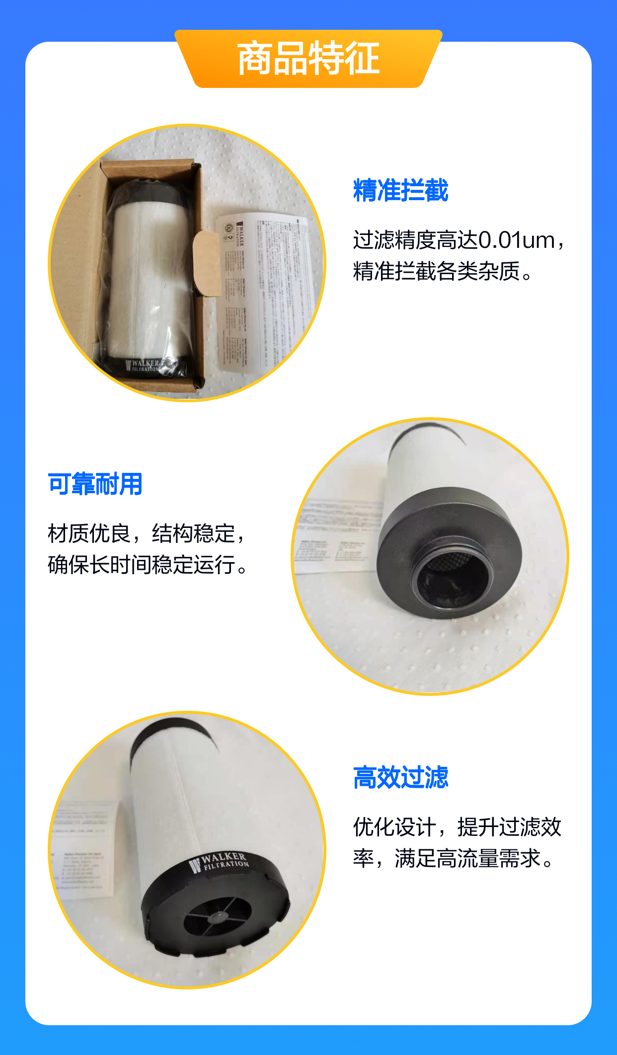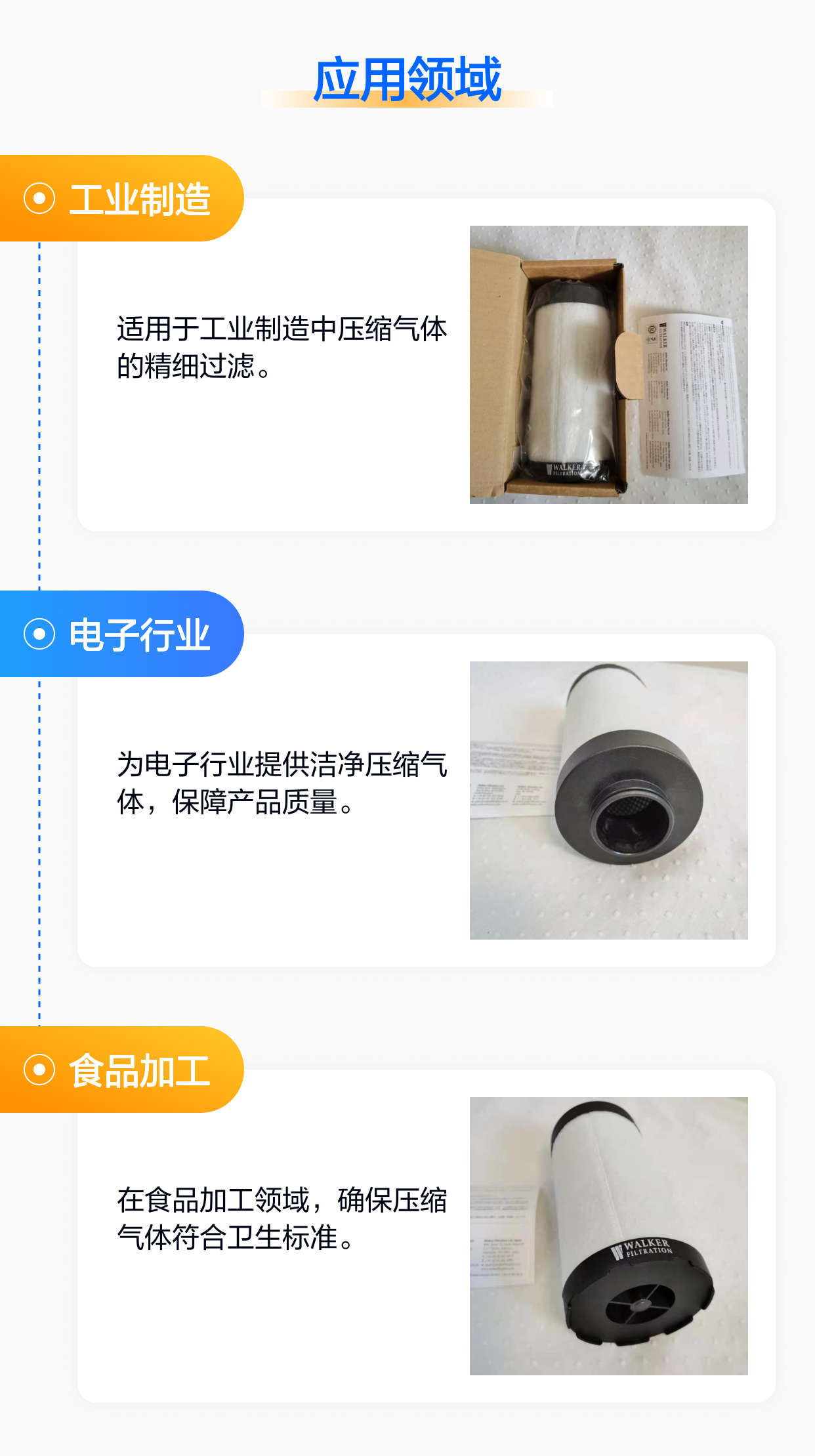 WALKER过滤器广泛应用于工业领域,比如气体分离(空分行业)、电子行业、食品行业、制药行业、汽车行业、呼吸用气、真空、采矿与挖掘、精密设备保护等对压缩空气质量要求较高的场合。 |