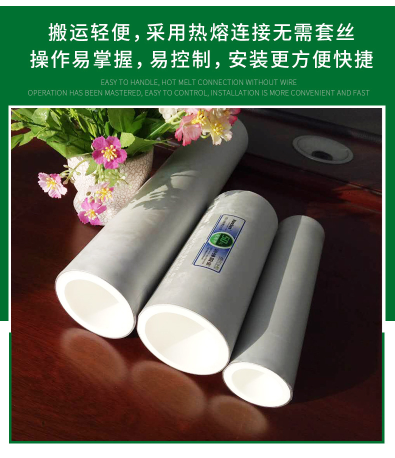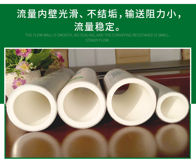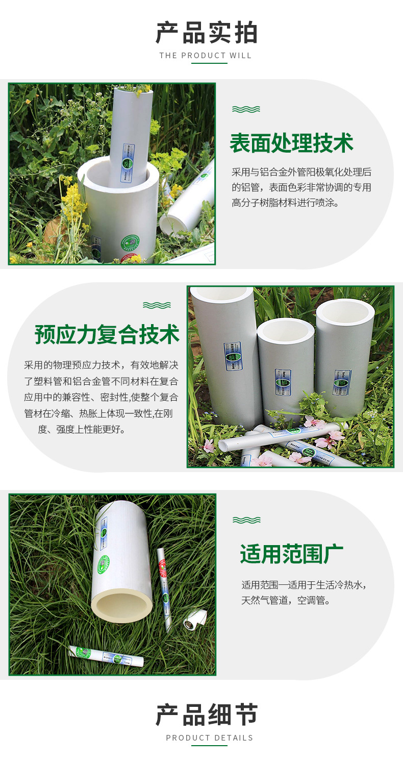 绿色环保 铝合金衬塑复合管的内衬层PP-R/PE-RT/PB/PE材料,它与水中的离子和可能与其接触的化学物质均不发生化学反应;如PP-R原材料分子中只有碳、氢两种元素,无其他有害元素,卫生无毒,耐腐蚀不结垢,属于绿色环保产品,可以用于纯净水饮用系统、液态饮料类输送系统、液态药剂类输送系统等。铝合金衬塑复合管在生产、施工及使用的过程中,均不会对环境造成任何污染。